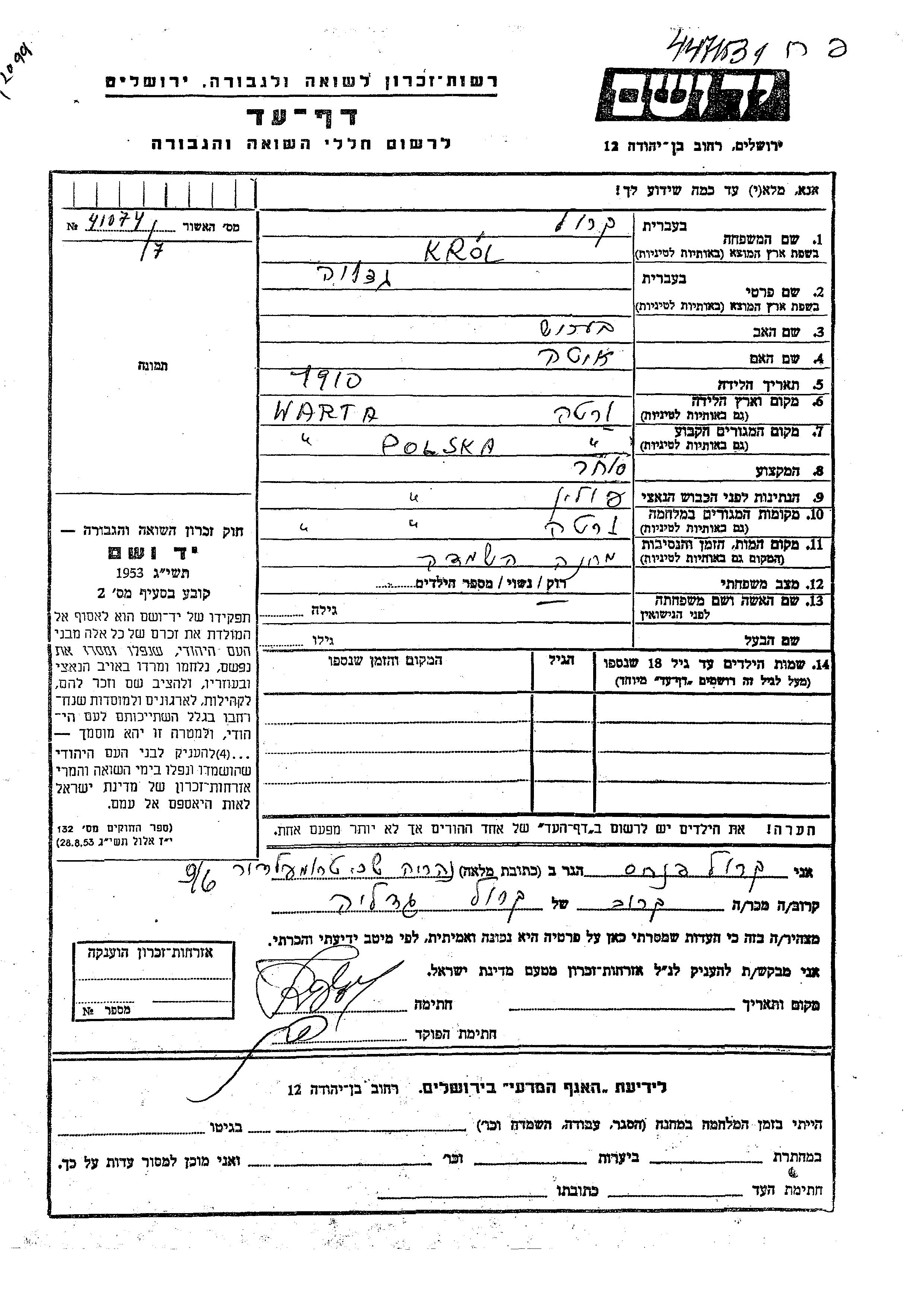 Gedalia Krol wurde im Jahr 1910 in Warta, Polen geboren. Er war der Sohn von Ber und Ita. Er war Kaufmann/-frau und Ledig. Vor dem Zweiten Weltkrieg lebte er in Warta, Polen. Während des Krieges war er in Warta, Polen.
