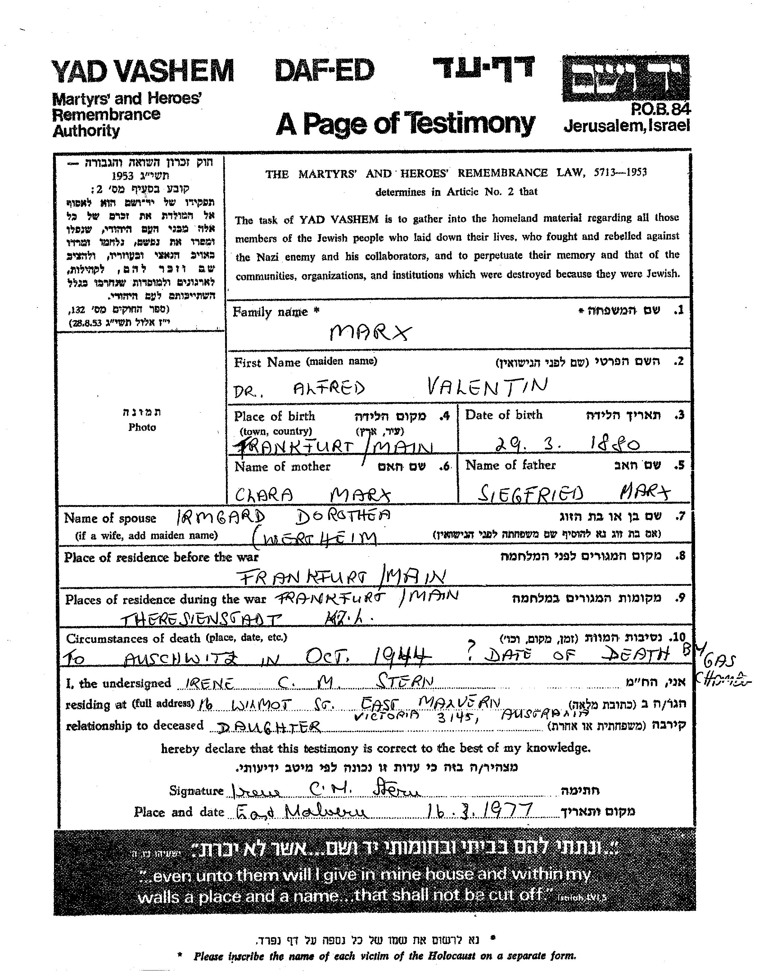 Dr. Marx wurde in der Schoah ermordet. Todesort: Auschwitz, Polen im Jahr 10/1944.