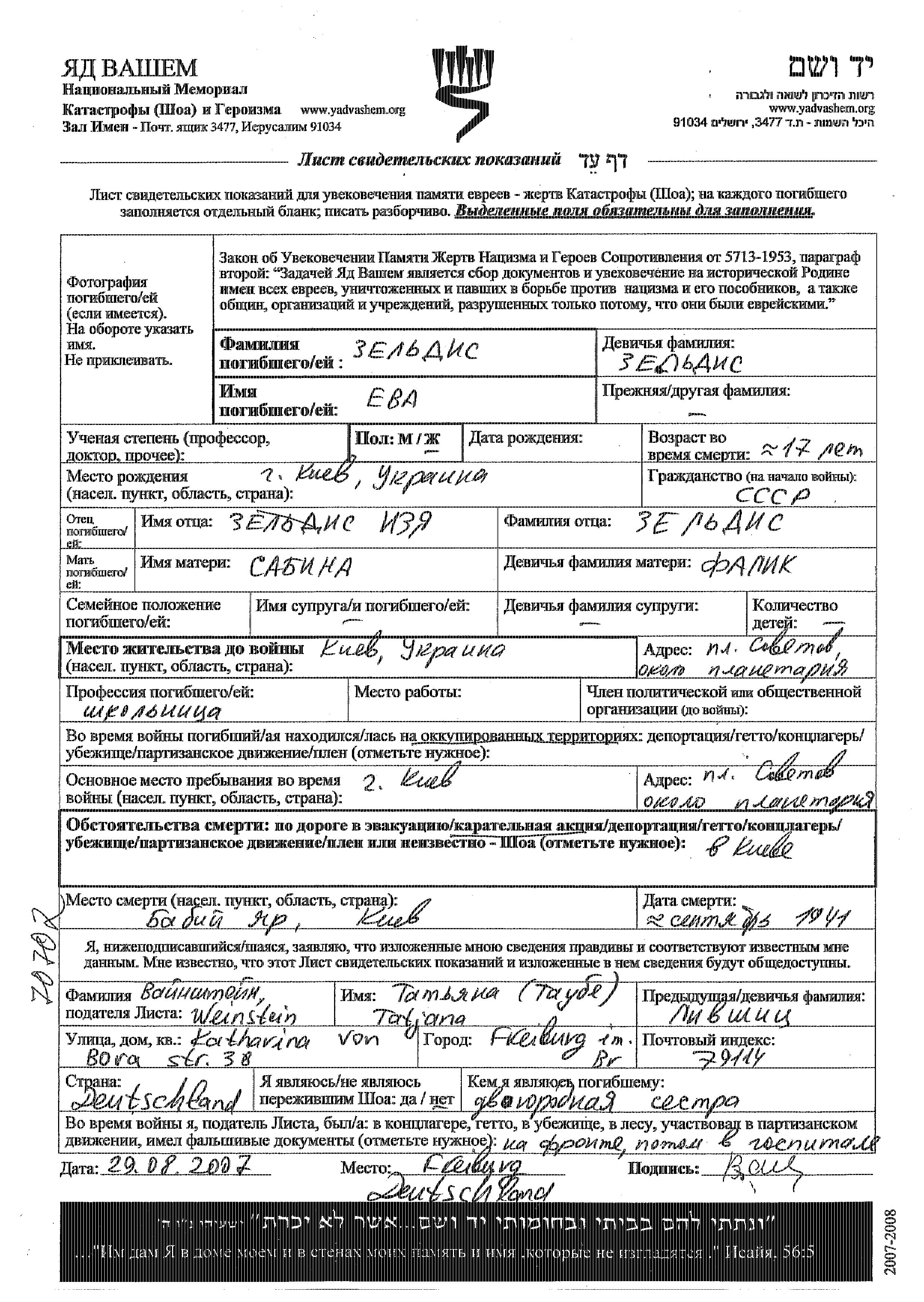 Yeva wurde in der Schoah ermordet. Todesort: Babi Yar, Ukraine (UdSSR) im Jahr 09/1941.