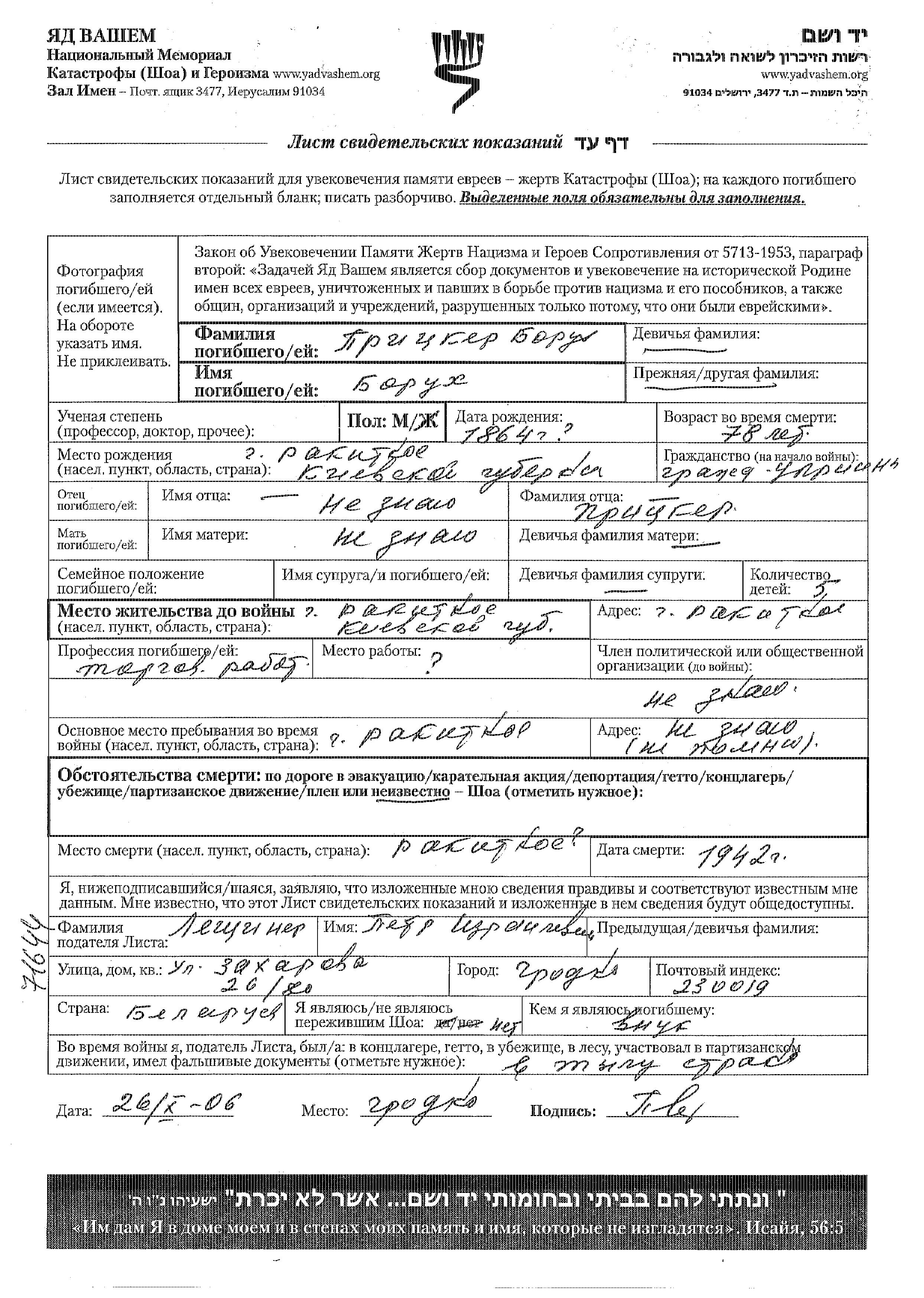 Borukh Pritzker wurde im Jahr 1864 in Rakitnoye, Ukraine (UdSSR) geboren. Er war Handelsangestellter. Vor dem Zweiten Weltkrieg lebte er in Rakitnoye, Ukraine (UdSSR). Während des Krieges war er in Rakitnoye, Ukraine (UdSSR).