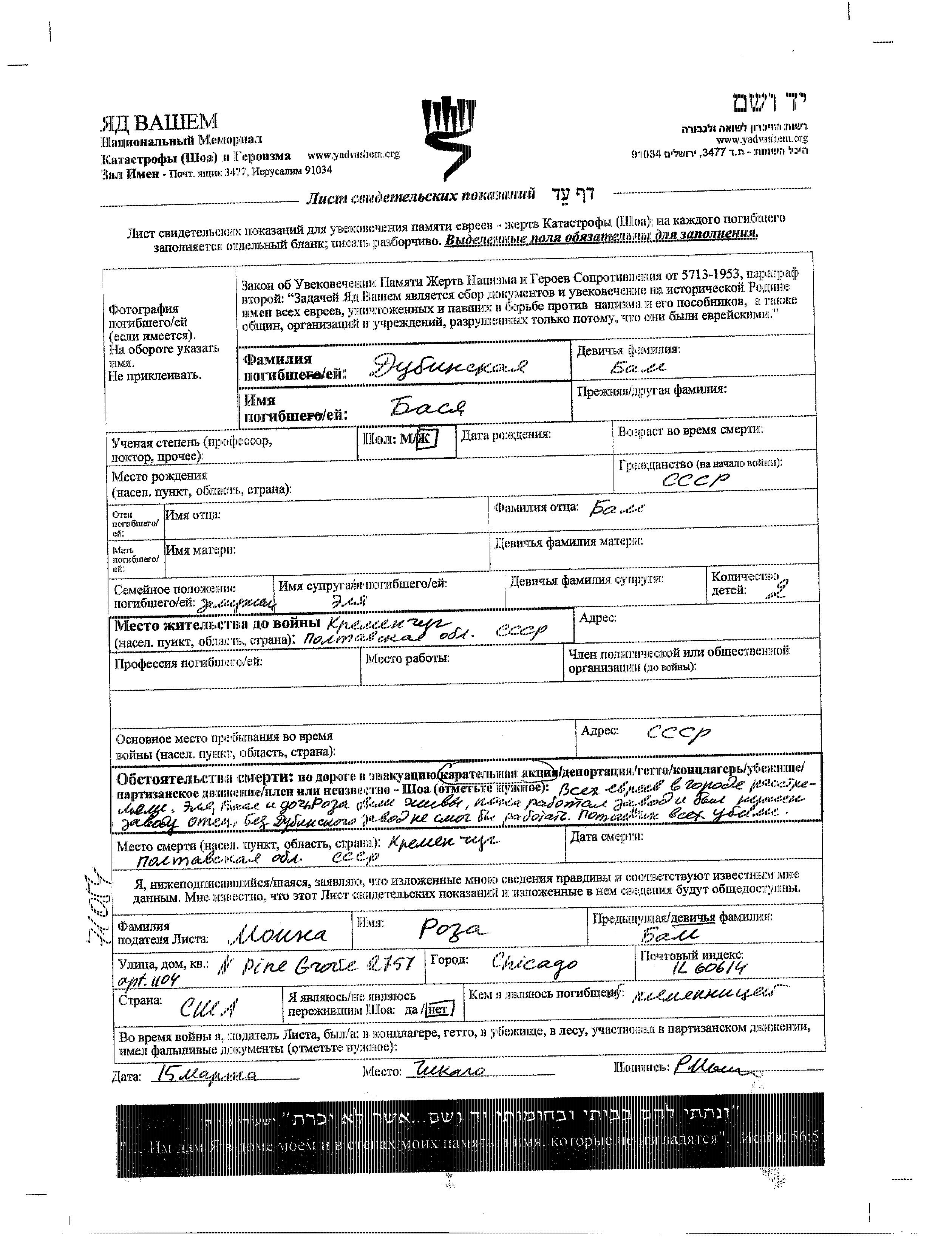 Basya Dubinskaya, geb. Bam wurde in Kremenchug, Ukraine (UdSSR) geboren. Sie war mit Elya Verheiratet. Vor dem Zweiten Weltkrieg lebte sie in Kremenchug, Ukraine (UdSSR). Während des Krieges war sie in Kremenchug, Ukraine (UdSSR).