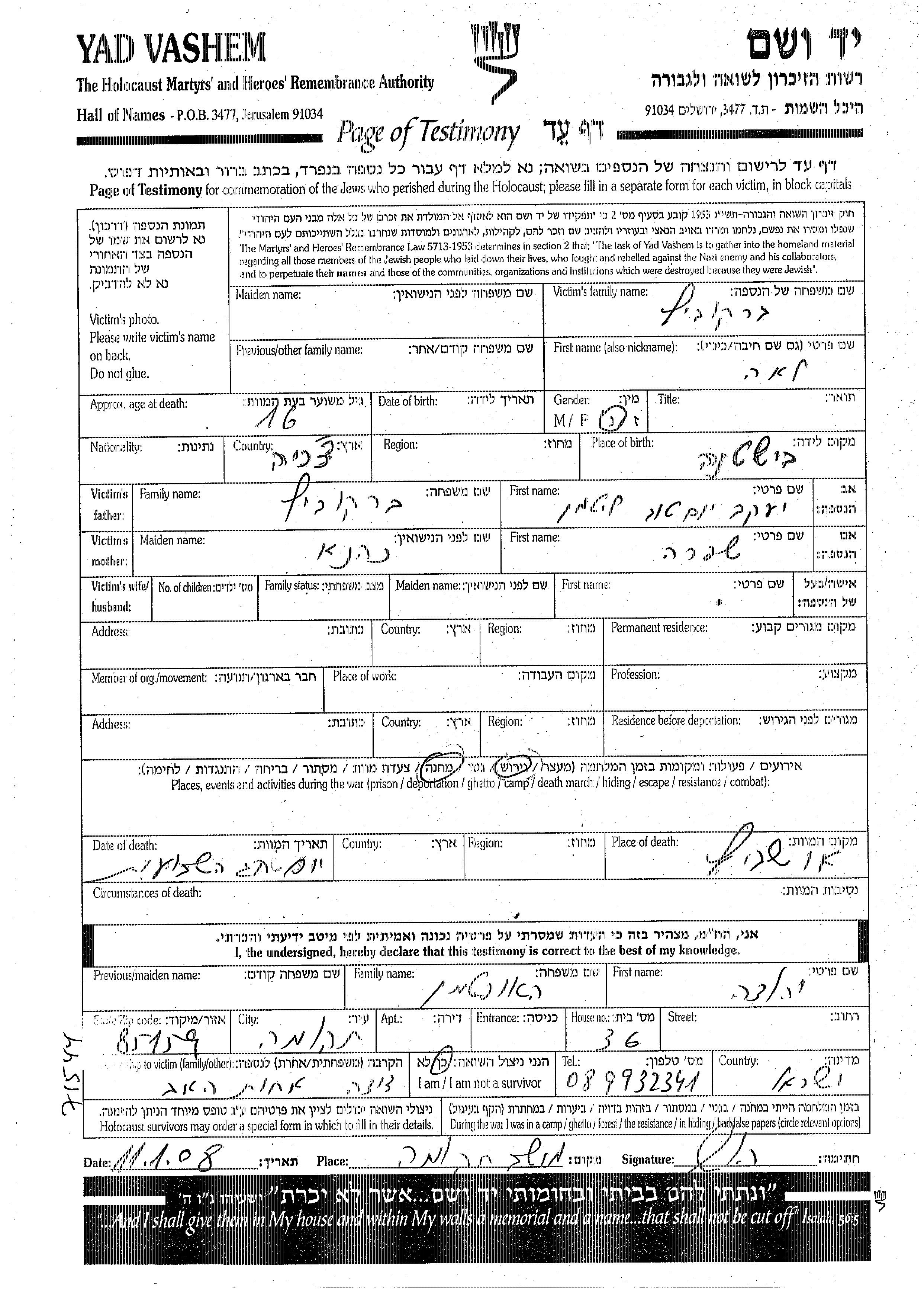 Berkovitz Lea unbekannter Ort, Gedenkblatt
