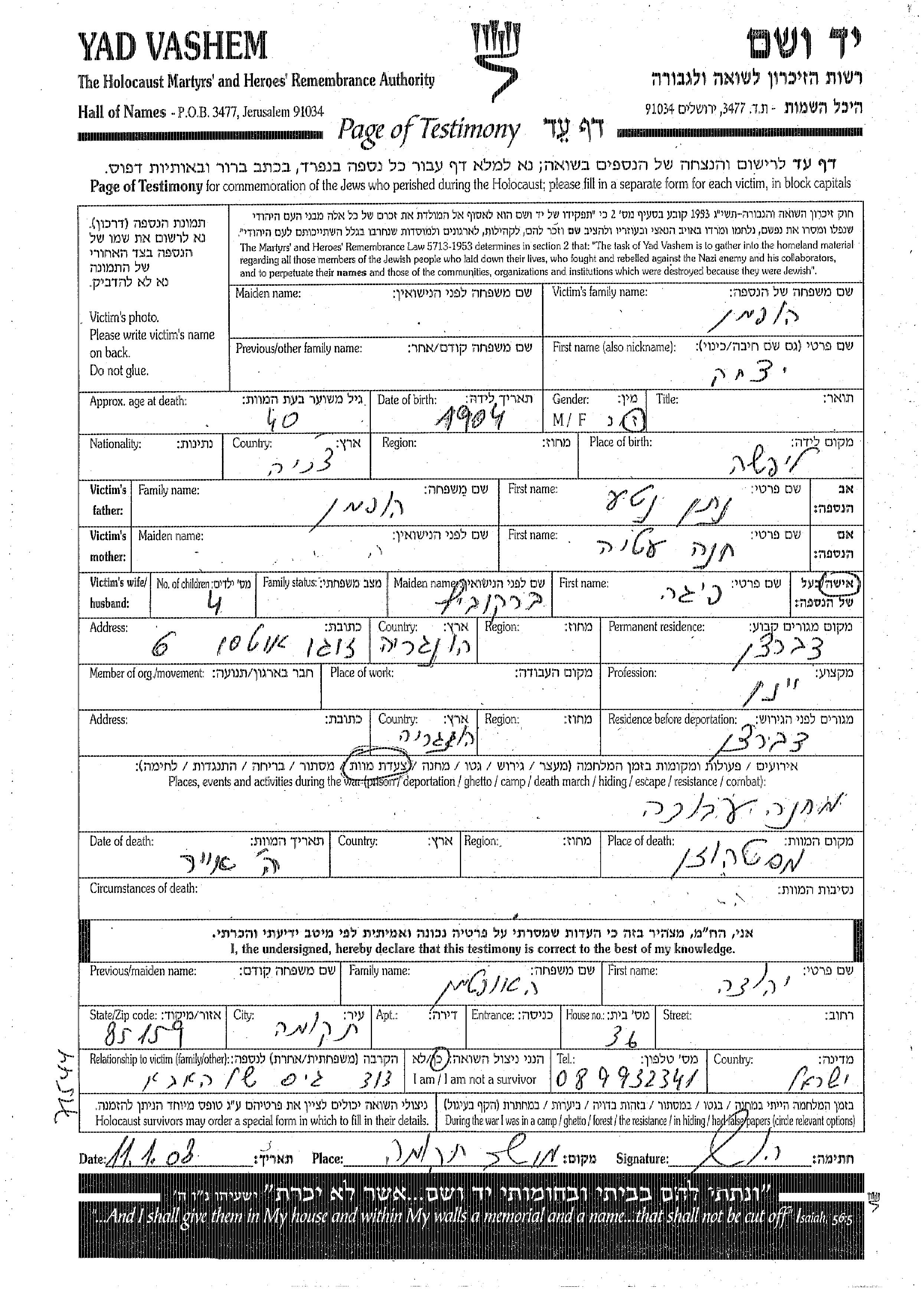 Hofman Yitzkhak 1904 Debrecen, Ungarn Gedenkblatt