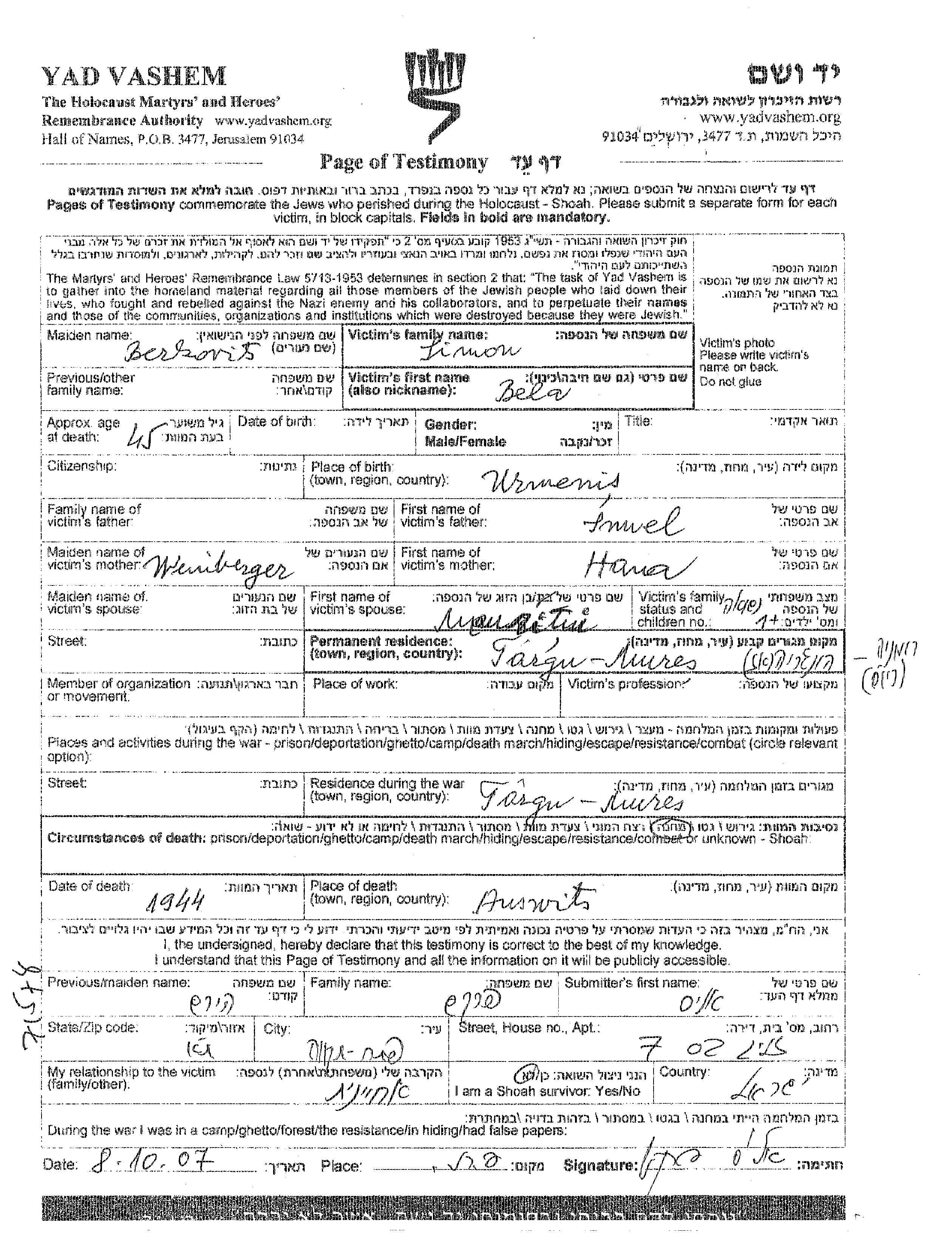 Bela Simon, geb. Berkovits wurde in Urmenis, Rumänien geboren. Sie war die Tochter von Smuel und Hana, geb. Weinberger. Sie war mit Mauritiu Verheiratet. Vor dem Zweiten Weltkrieg lebte sie in Targu Mures, Rumänien. Während des Krieges war sie in Targu Mures, Rumänien.