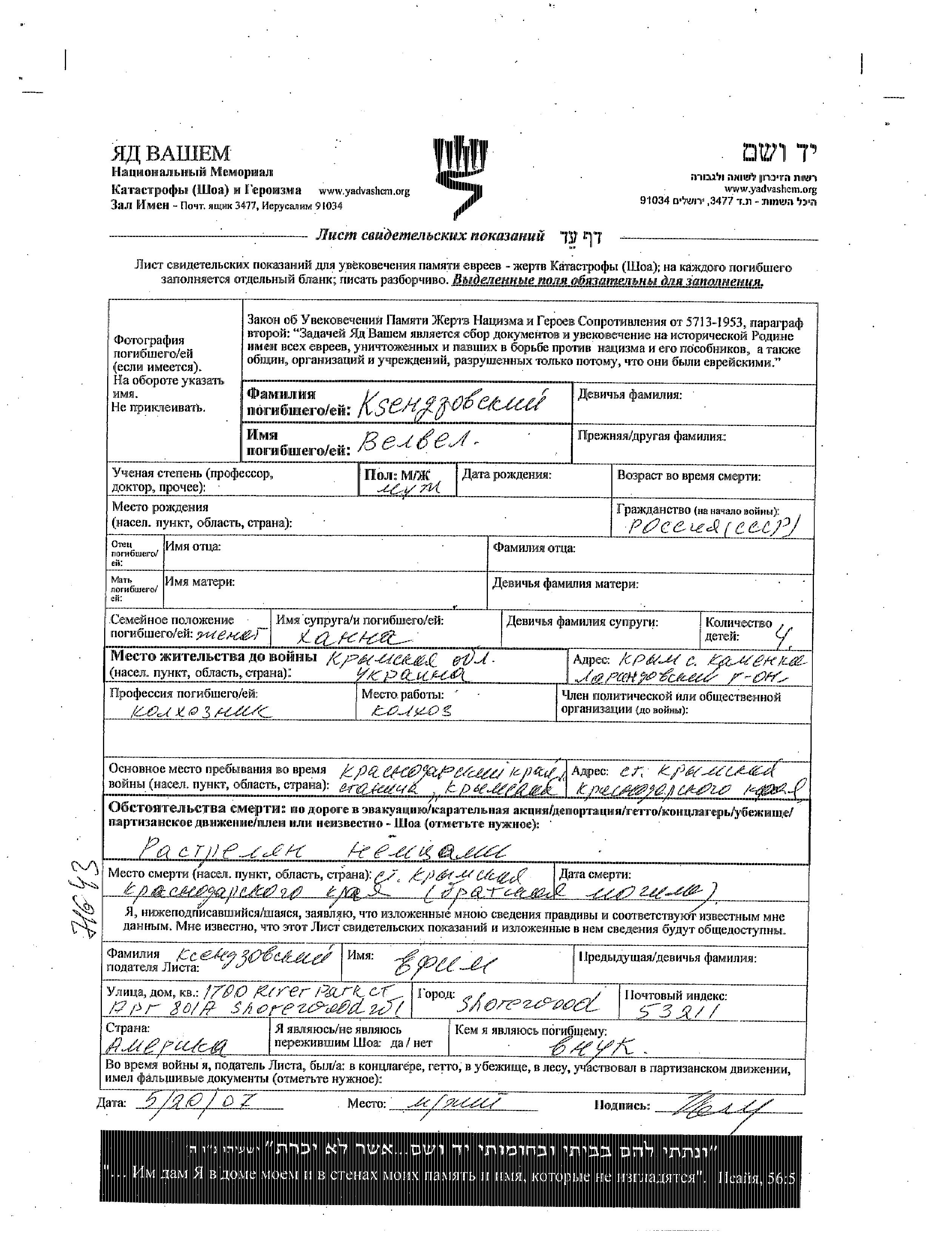 Velvl Ksendzovski. Er war Kolchosbauer/-bäuerin und mit Khanna Verheiratet. Vor dem Zweiten Weltkrieg lebte er in Krym ASSR, Russland (UdSSR). Während des Krieges war er in Krymskaya, Russland (UdSSR).