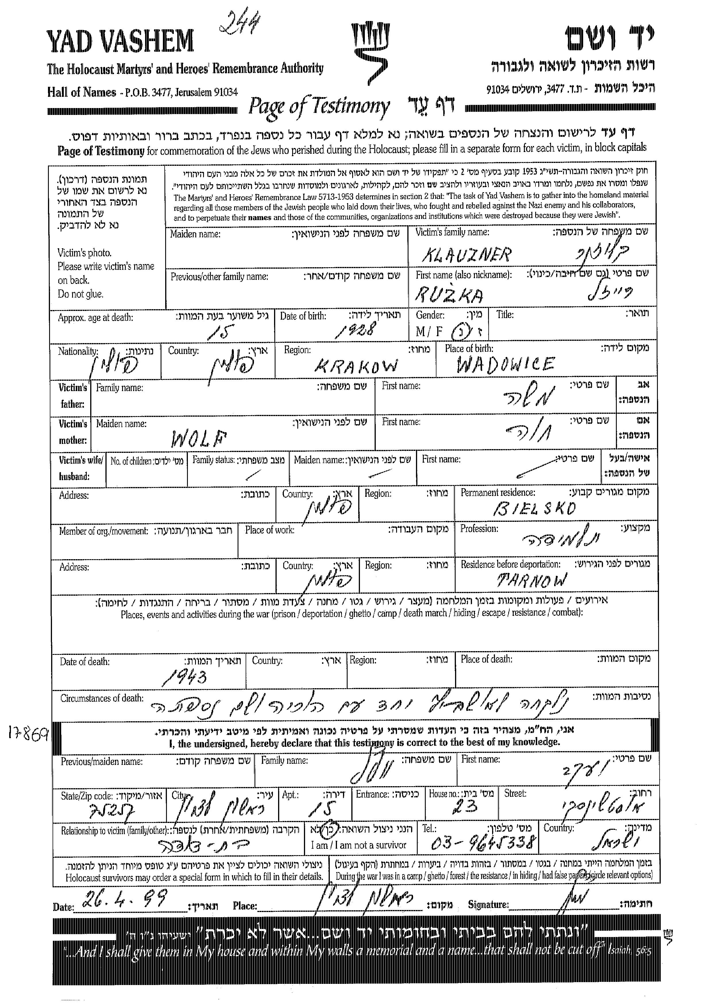 Ruzka Klauzner wurde im Jahr 1928 in Wadowice, Polen geboren. Sie war die Tochter von Moshe und Khava, geb. Wolf. Sie war Schüler/-in. Vor dem Zweiten Weltkrieg lebte sie in Bielsko, Polen. Während des Krieges war sie in Tarnow, Polen.