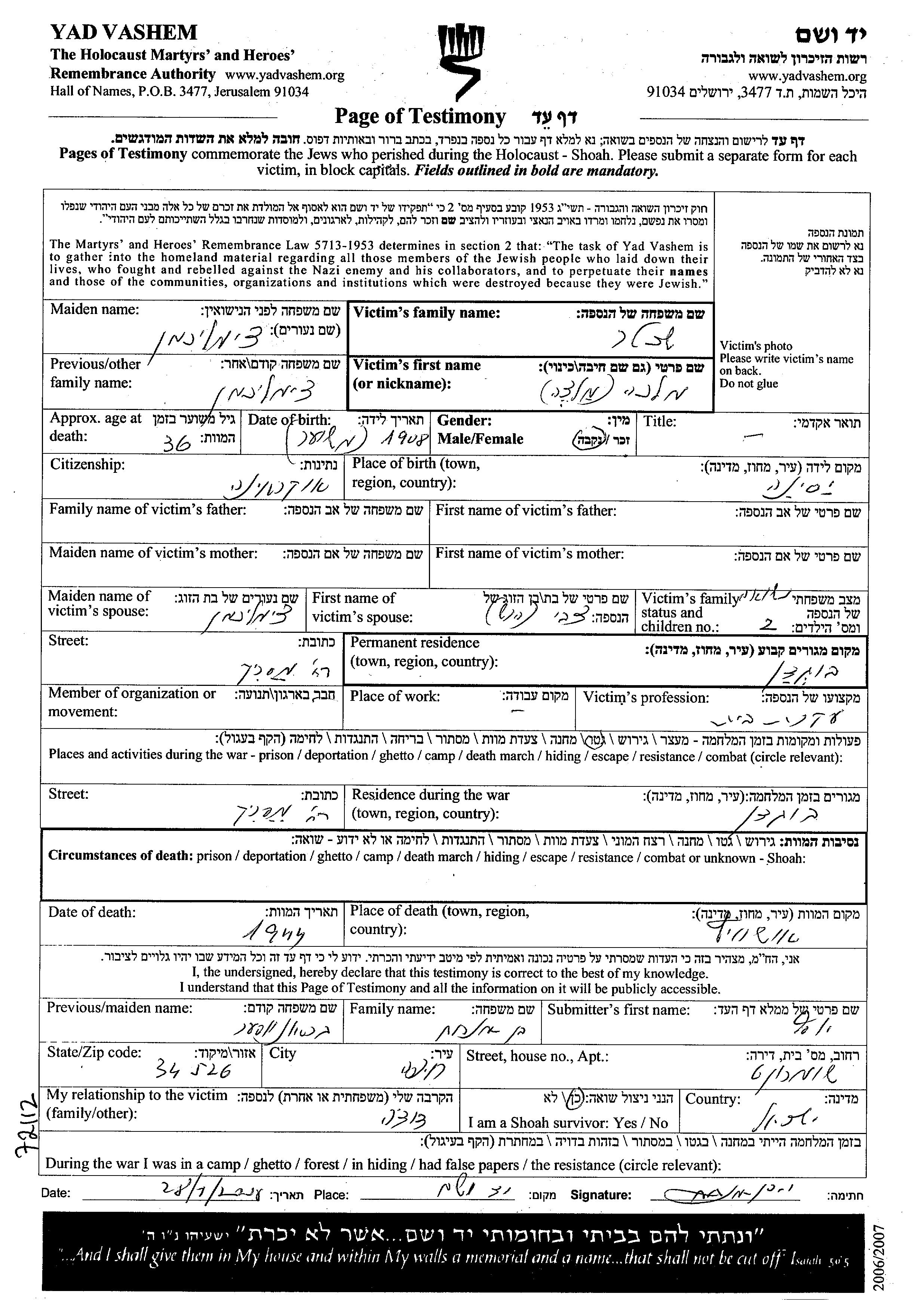 Malka Shekhter, geb. Tzimlikhman wurde im Jahr 1908 in Yasina, Tschechoslowakei geboren. Sie war Hausfrau und mit Tzvi Hersh Verheiratet. Vor dem Zweiten Weltkrieg lebte sie in Bogdan, Tschechoslowakei. Während des Krieges war sie in Bogdan, Tschechoslowakei.