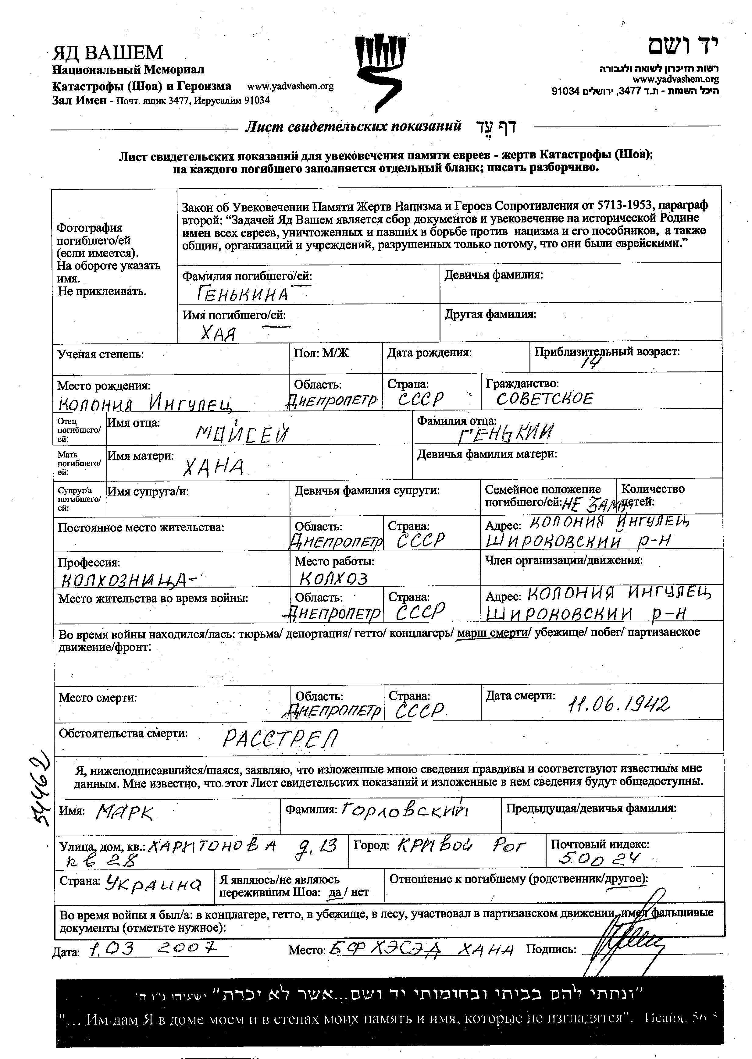 Khaya wurde in der Schoah ermordet. Todesort: Dnepropetrovsk, Ukraine (UdSSR) im Jahr 11/06/1942.