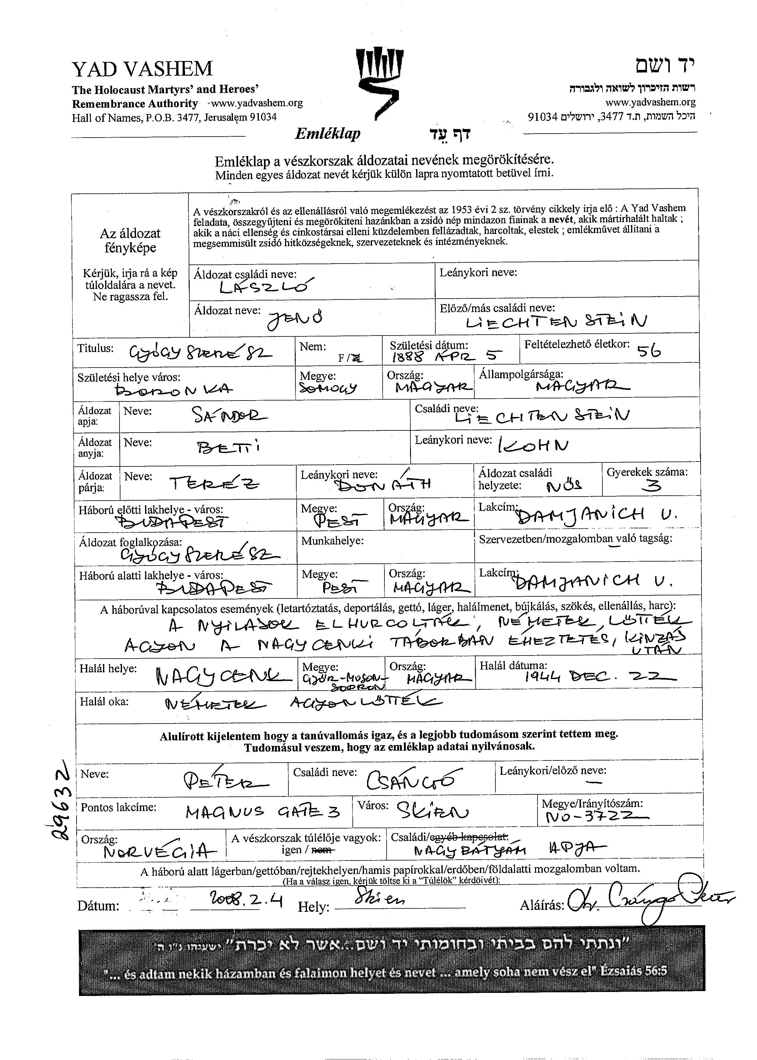 Jeno Laszlo Liechtenstein wurde im Jahr 1888 in Baranka, Tschechoslowakei geboren. Er war der Sohn von Sandor und Betti, geb. Kohn. Er war Apotheker/-in und mit Terez, geb. Donath Verheiratet. Vor dem Zweiten Weltkrieg lebte er in Budapest, Ungarn. Während des Krieges war er in Budapest, Ungarn.