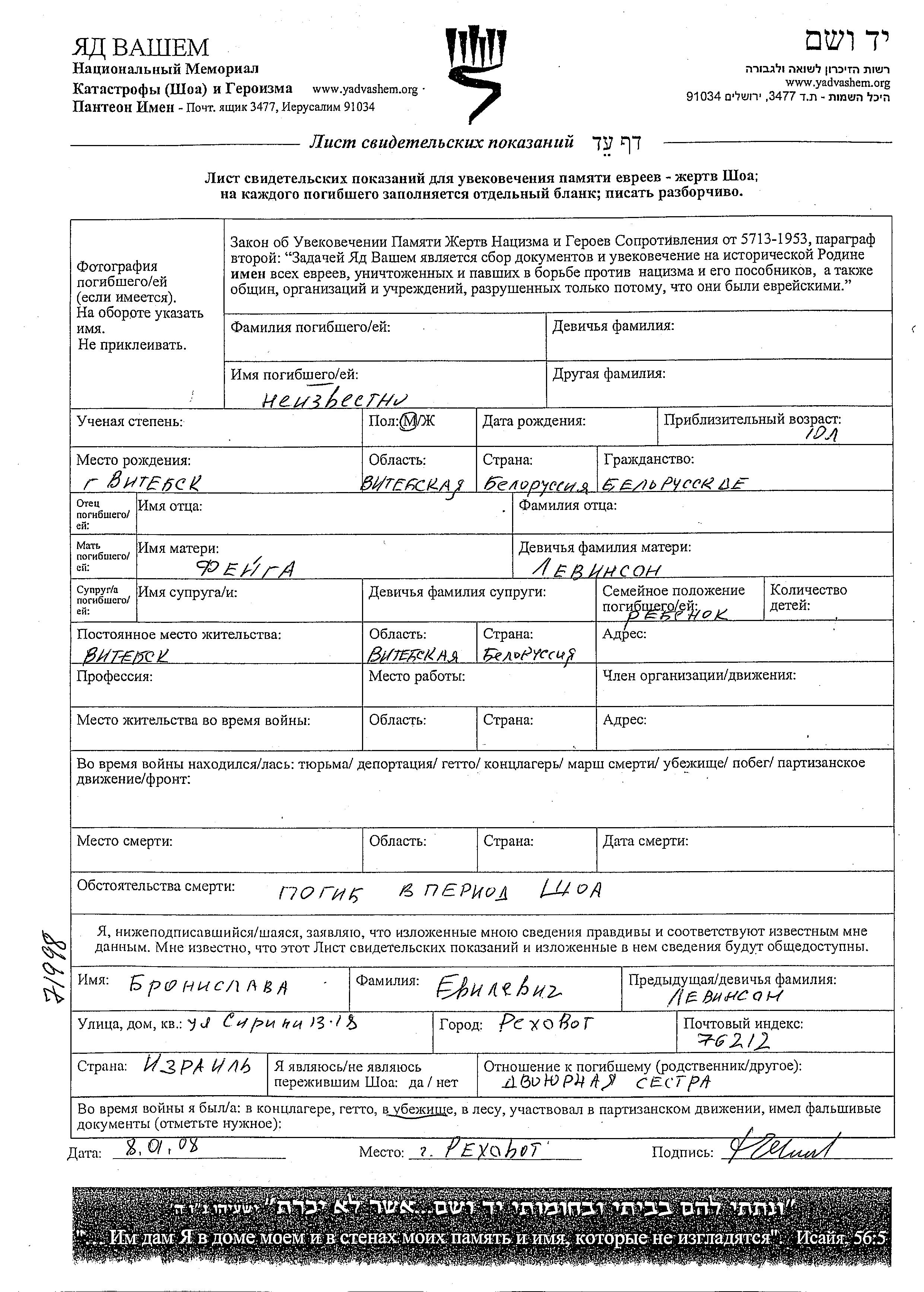Name unbekannt Vorname unbekannt Vitebsk, Weißrussland (UdSSR) Gedenkblatt