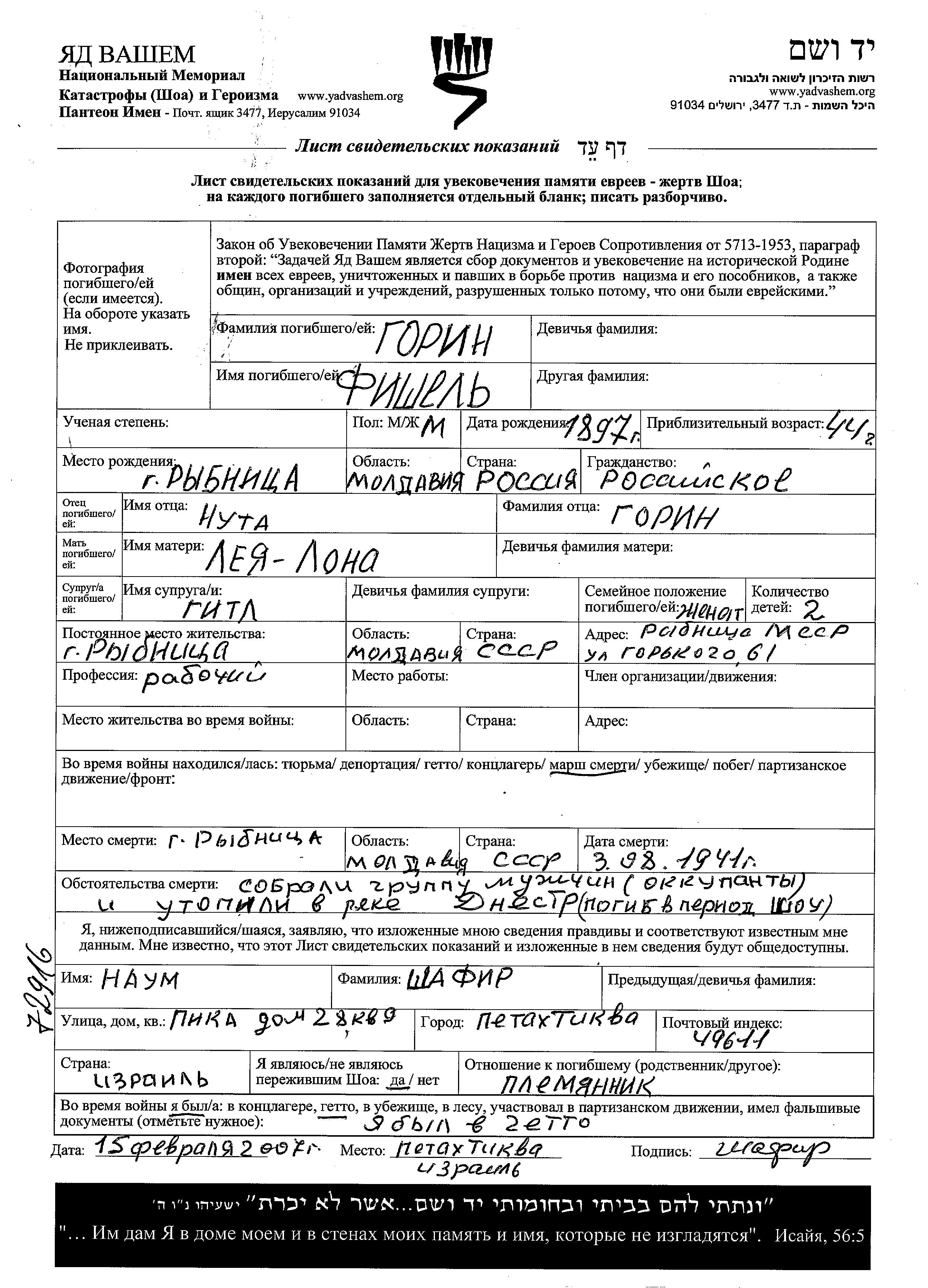 Fishel Gorin wurde im Jahr 1897 in Rybnitsa, Ukraine (UdSSR) geboren. Er war der Sohn von Nuta und Lea Lona. Er war Arbeiter/-in und mit Gitl Verheiratet. Vor dem Zweiten Weltkrieg lebte er in Rybnitsa, Ukraine (UdSSR).
