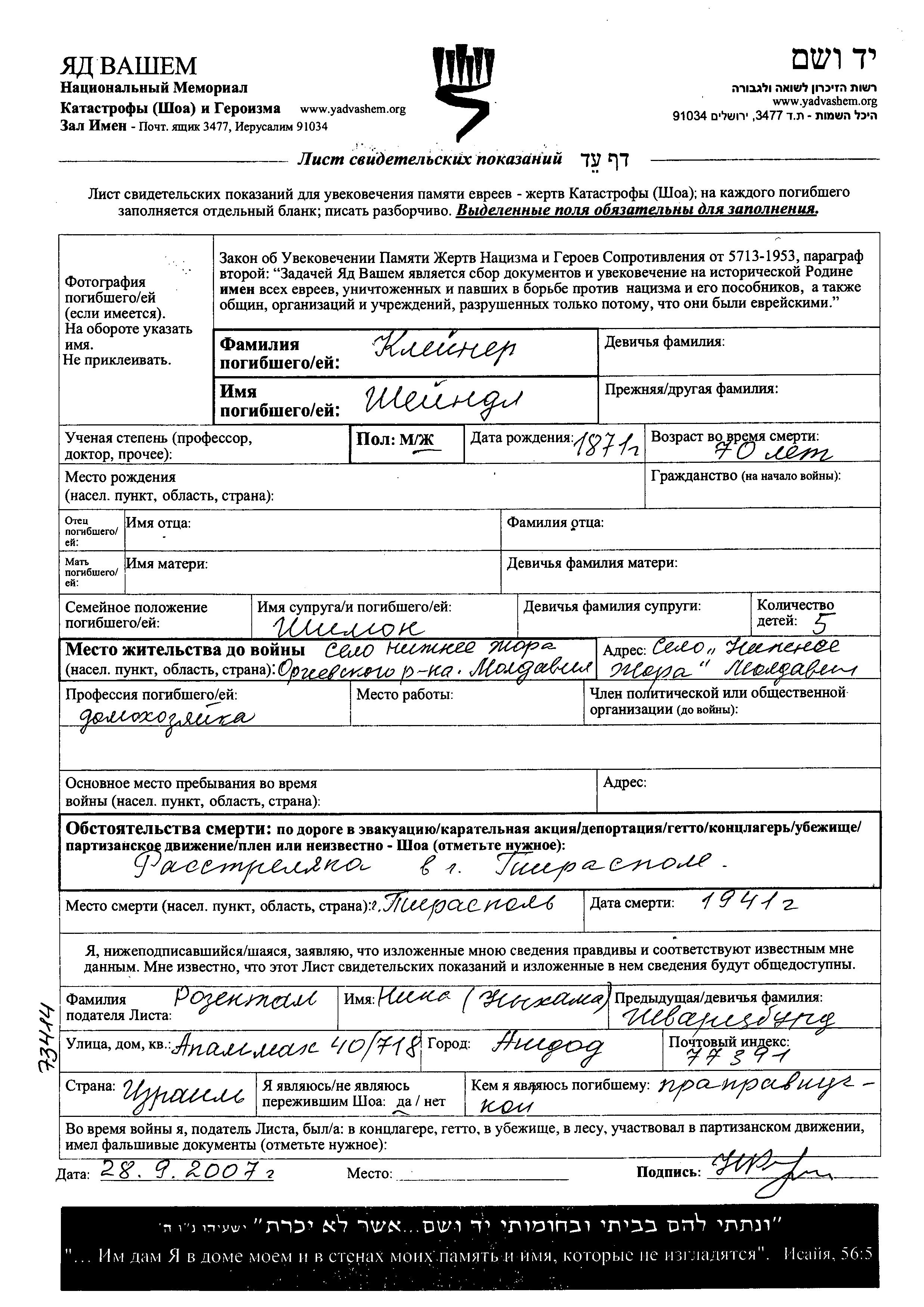 Sheyndl wurde in der Schoah ermordet. Todesort: Tiraspol, Ukraine (UdSSR) im Jahr 1941.