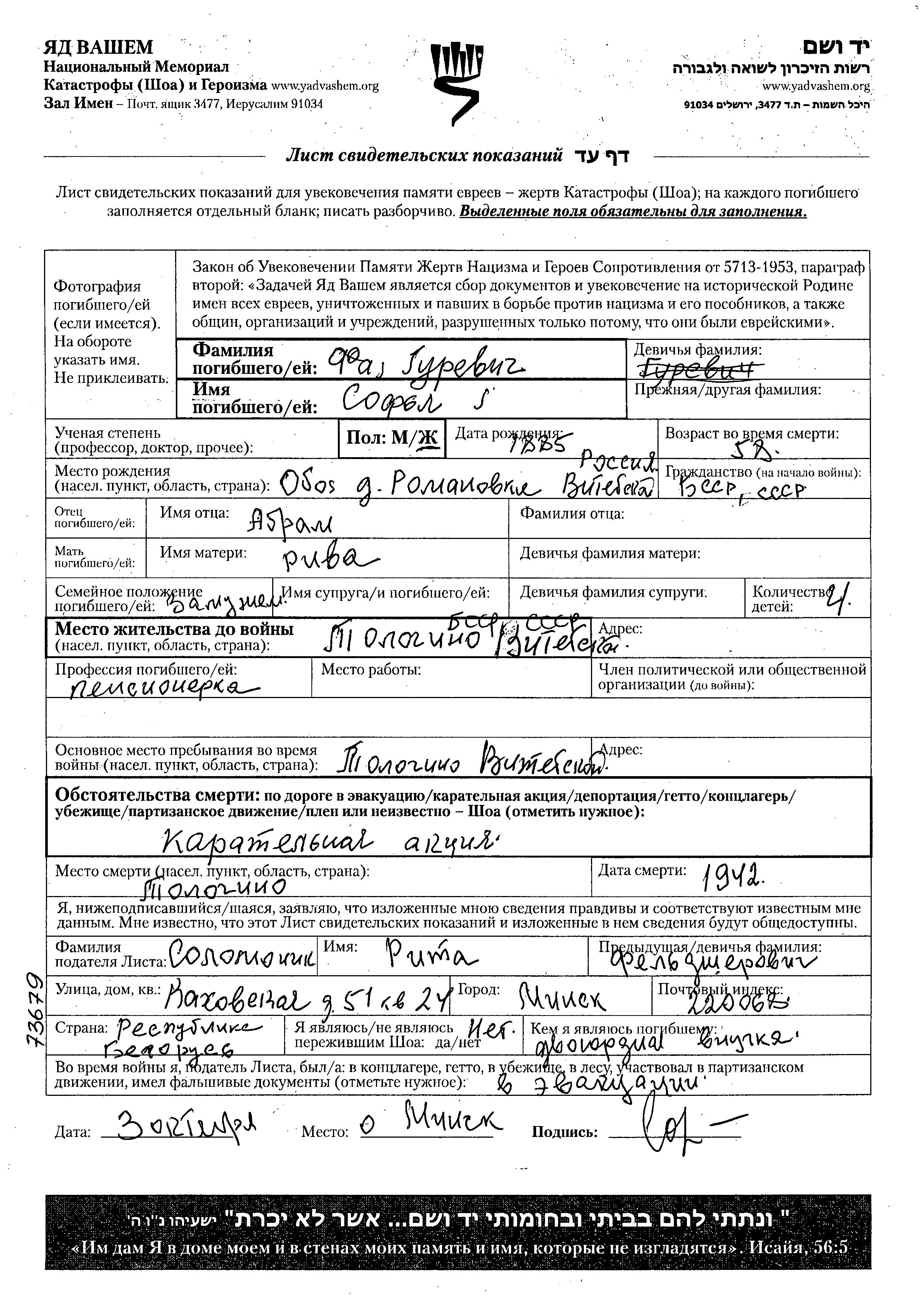 Sofia Faz Gurevich wurde im Jahr 1885 in Romanovka, Weißrussland (UdSSR) geboren. Sie war die Tochter von Abram und Riva. Sie war Verheiratet. Vor dem Zweiten Weltkrieg lebte sie in Tolochin, Weißrussland (UdSSR). Während des Krieges war sie in Tolochin, Weißrussland (UdSSR).