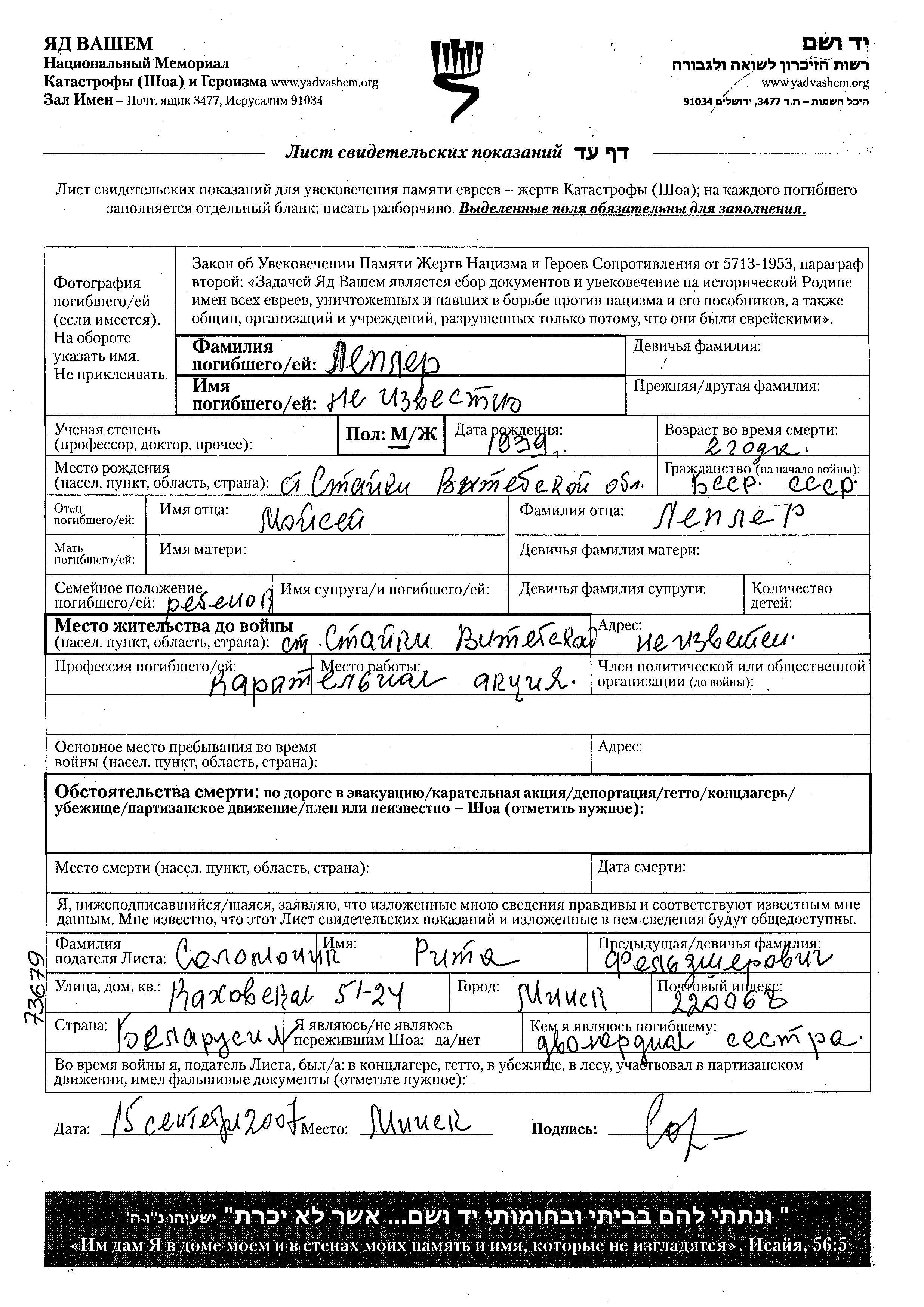 Vorname unbekannt Lepler wurde im Jahr 1939 in Stayki, Weißrussland (UdSSR) geboren. Er war der Sohn von Moysey. Er war Kind. Vor dem Zweiten Weltkrieg lebte er in Stayki, Weißrussland (UdSSR).