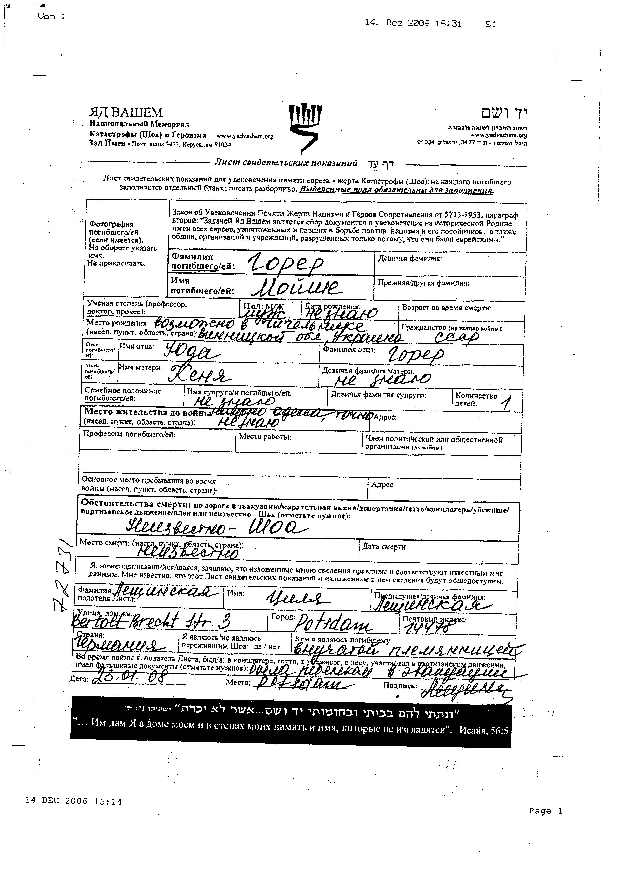 Moishe wurde in der Schoah ermordet.