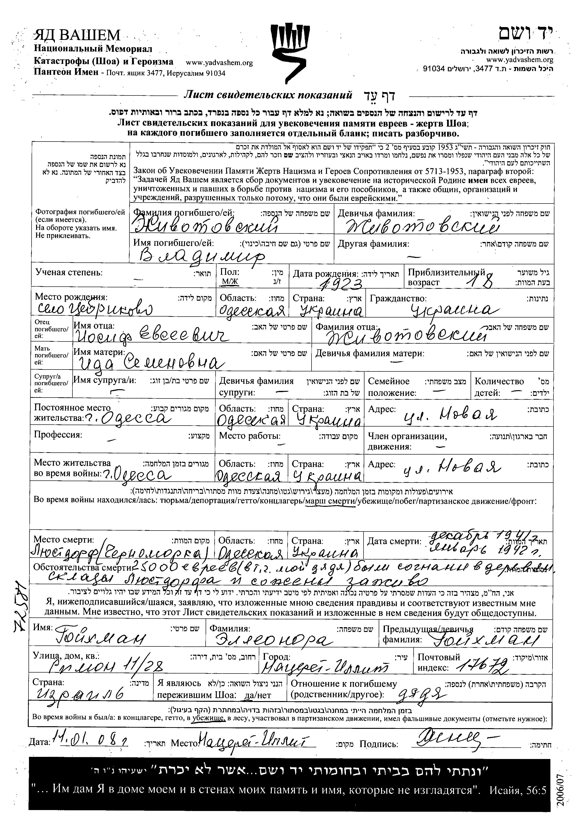 Vladimir wurde in der Schoah ermordet. Todesort: Chernomorka, Ukraine (UdSSR) im Jahr 12/1941.