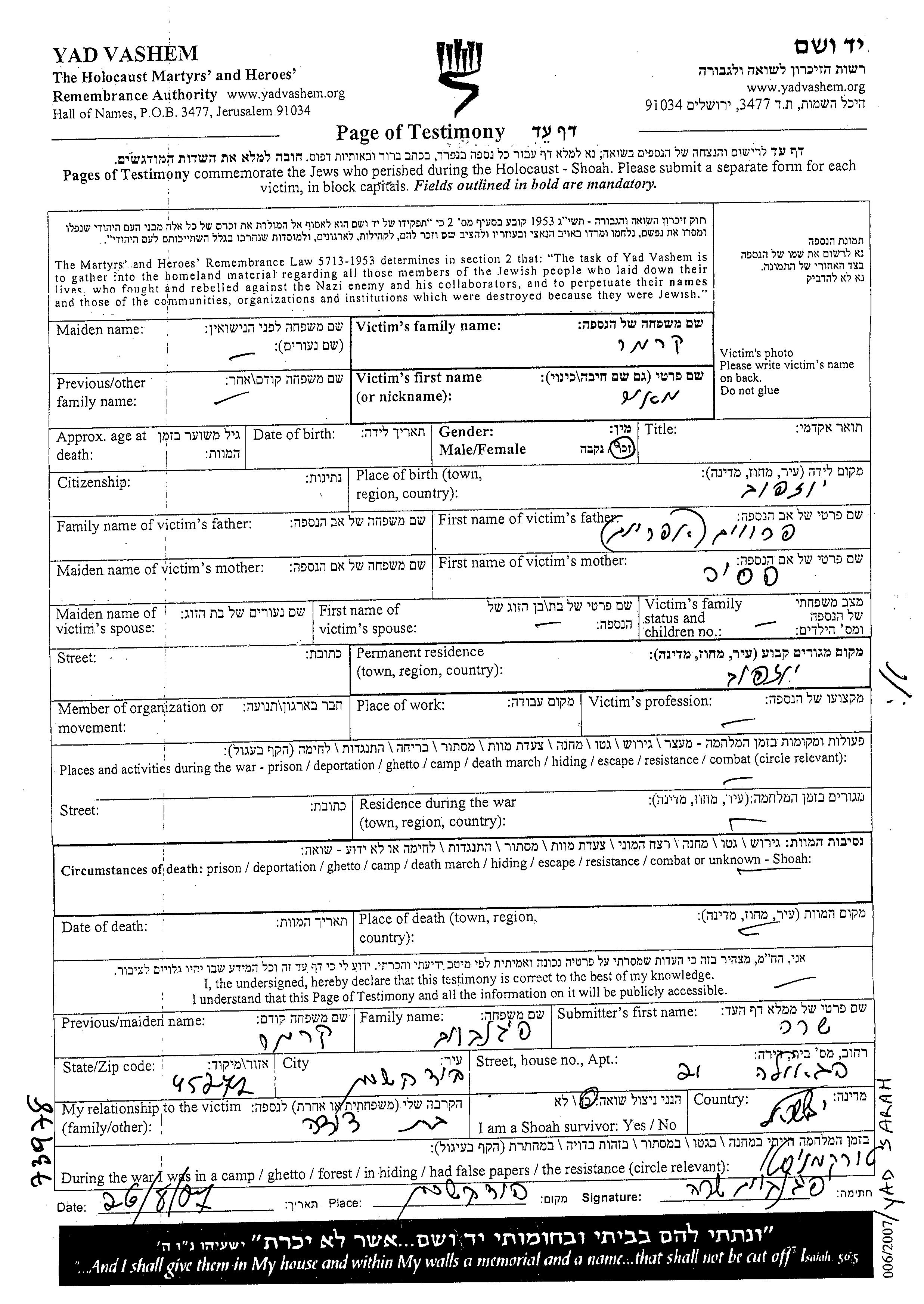 Kremer Meir Jozefow, Polen Gedenkblatt