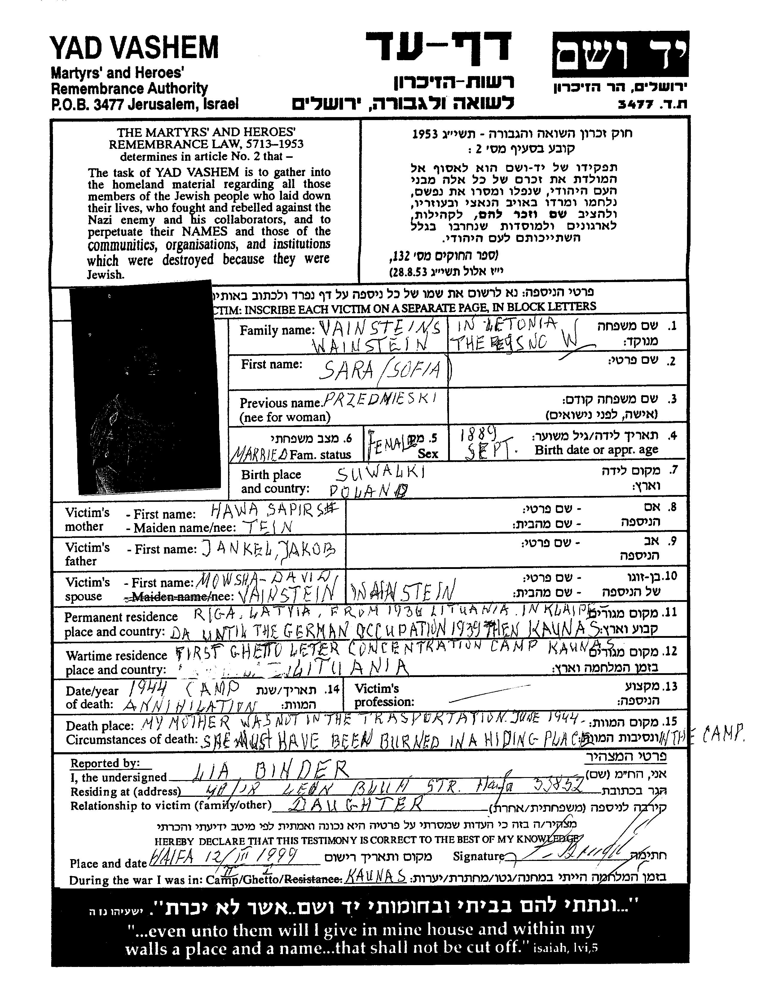 Sara Sofia Vainstein, geb. Przednieski wurde im Jahr 1889 in Suwalki, Polen geboren. Sie war die Tochter von Jankel und Hawa, geb. Sapirstein. Sie war mit Mowsha David Verheiratet. Vor dem Zweiten Weltkrieg lebte sie in Riga, Lettland. Während des Krieges war sie in Kaunas, Litauen.