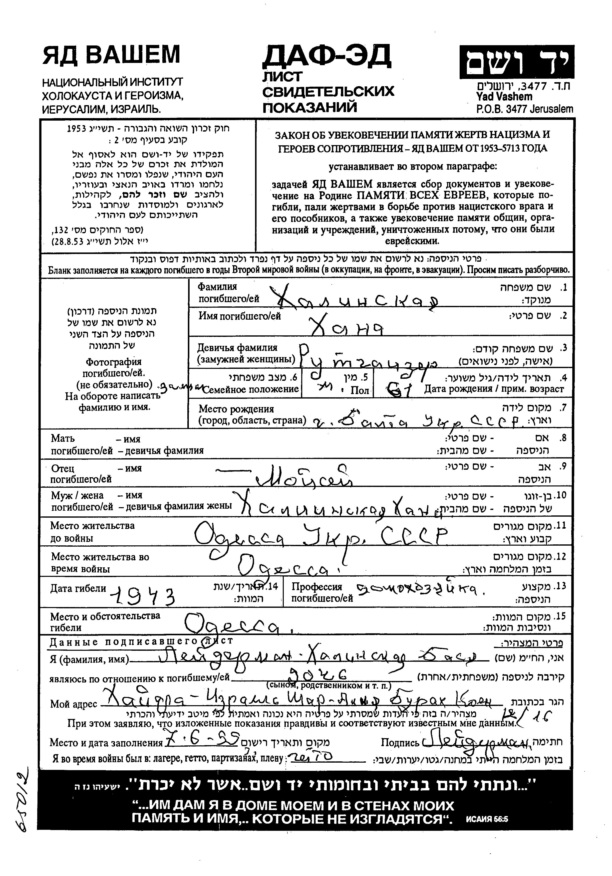 Khana wurde in der Schoah ermordet. Todesort: Odessa, Ukraine (UdSSR) im Jahr 1943.