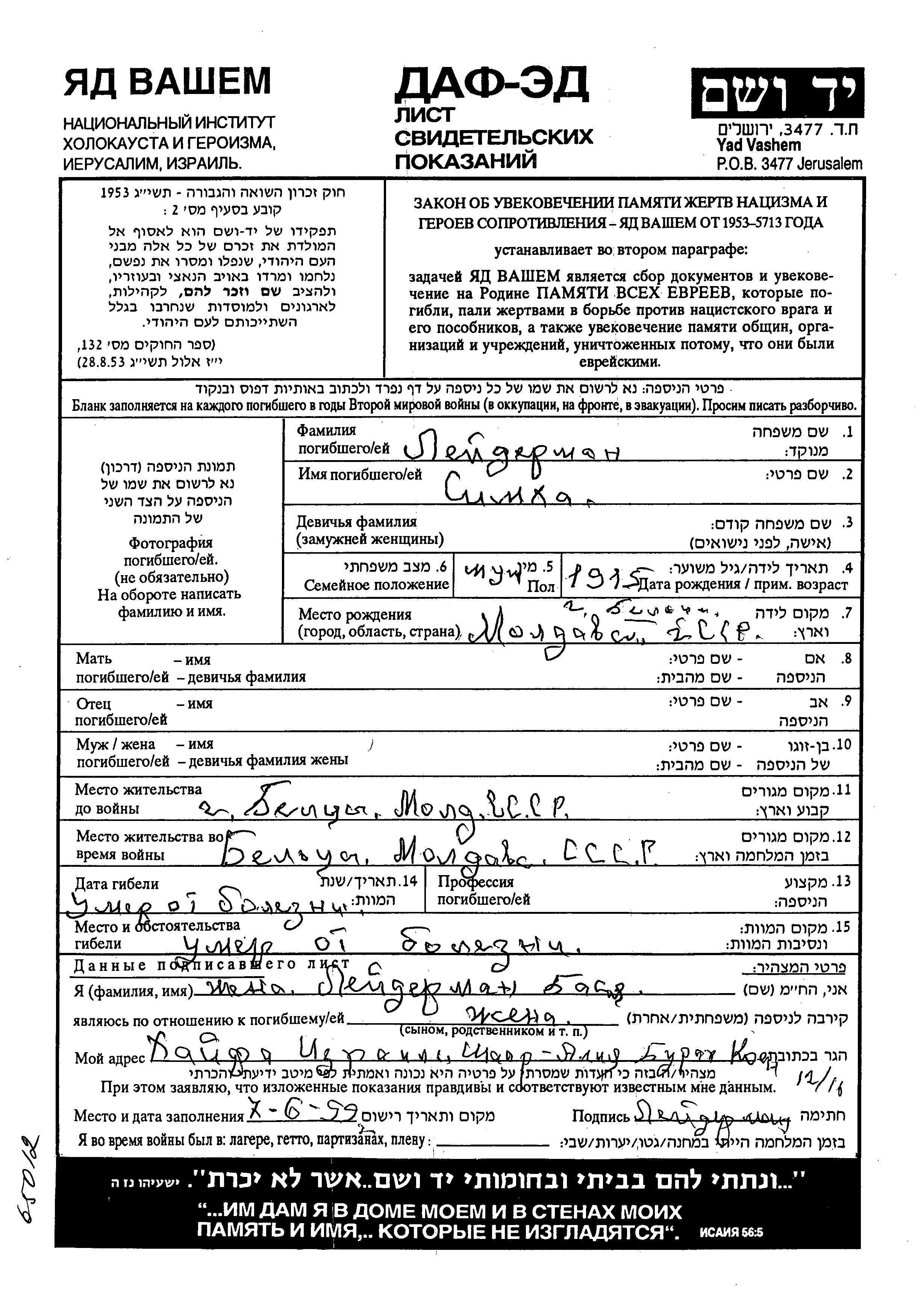 Leiderman Simkha 1915 Beltsy, Rumänien Gedenkblatt