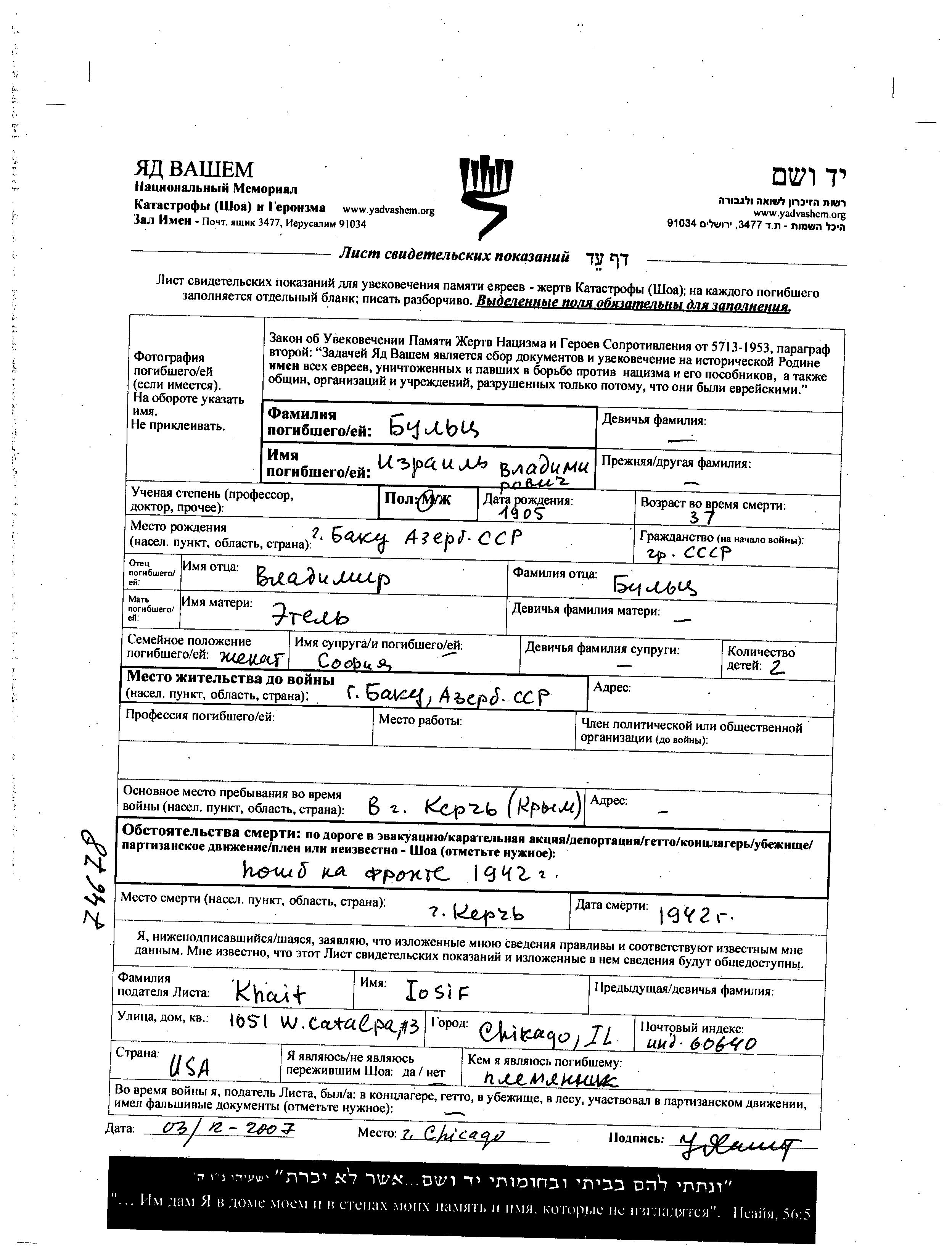 Izrail Bultz wurde im Jahr 1905 in Baku, Aserbaidschan (UdSSR) geboren. Er war der Sohn von Vladimir und Etel. Er war mit Sofiya Verheiratet. Vor dem Zweiten Weltkrieg lebte er in Baku, Aserbaidschan (UdSSR). Während des Krieges war er in die Sowjetischen Streitkräfte. Izrail im Militärdienst umgekommen. Todesort: Kerch, Russland (UdSSR) im Jahr 1942.