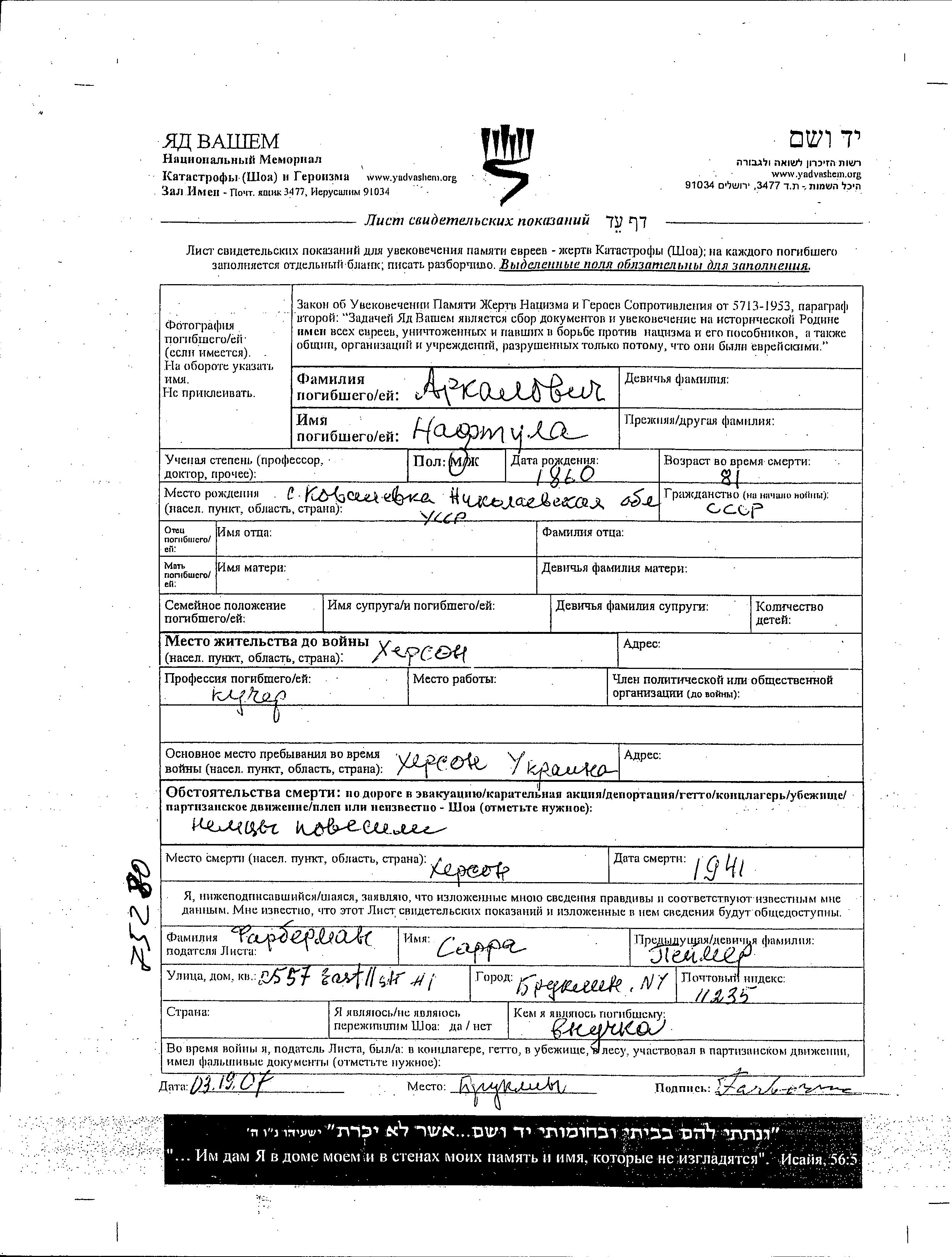Naftula Arkalovich wurde im Jahr 1860 in Kovalevka, Ukraine (UdSSR) geboren. Er war Kucher und Verheiratet. Vor dem Zweiten Weltkrieg lebte er in Kherson, Ukraine (UdSSR). Während des Krieges war er in Kherson, Ukraine (UdSSR).