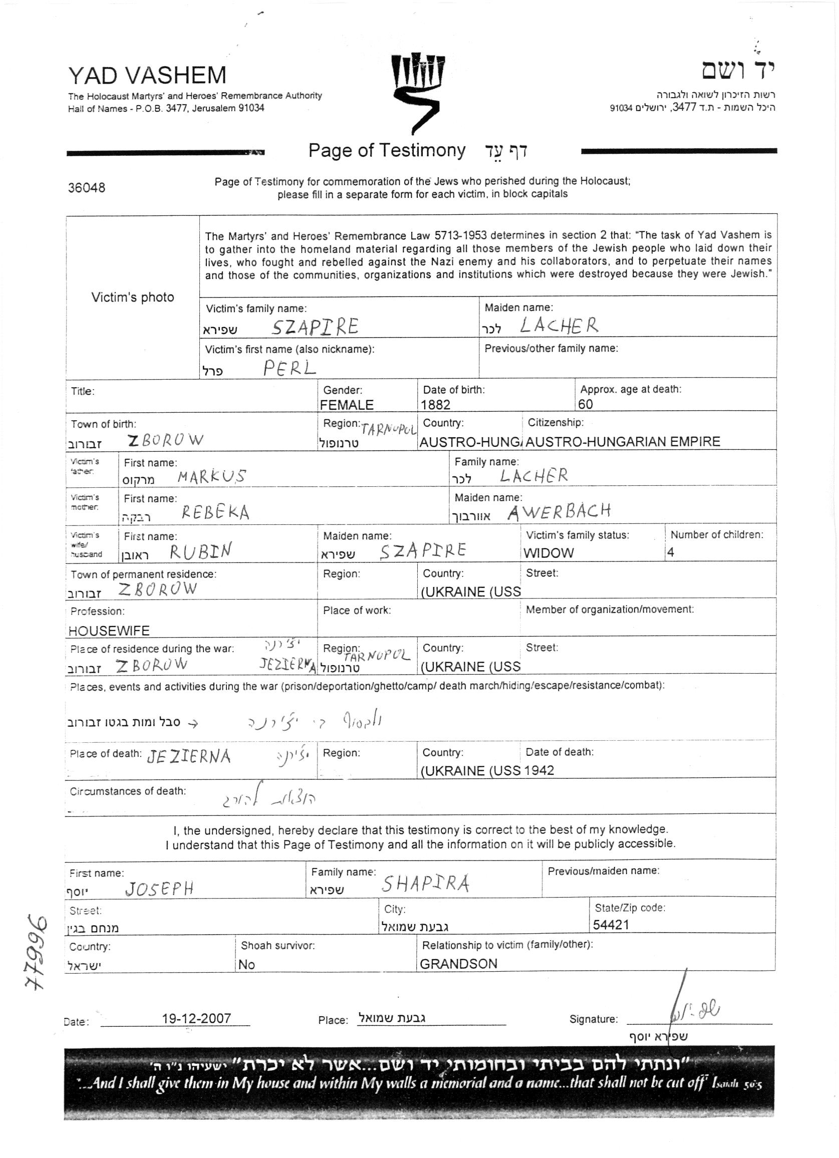 Perel Shpira, geb. Lakher wurde im Jahr 1882 in Zborow, Polen geboren. Sie war die Tochter von Markus und Rivka, geb. Averbukh Awerbach. Sie war Hausfrau und mit Reuven Witwe. Vor dem Zweiten Weltkrieg lebte sie in Zborow, Polen. Während des Krieges war sie in Zborow, Polen.