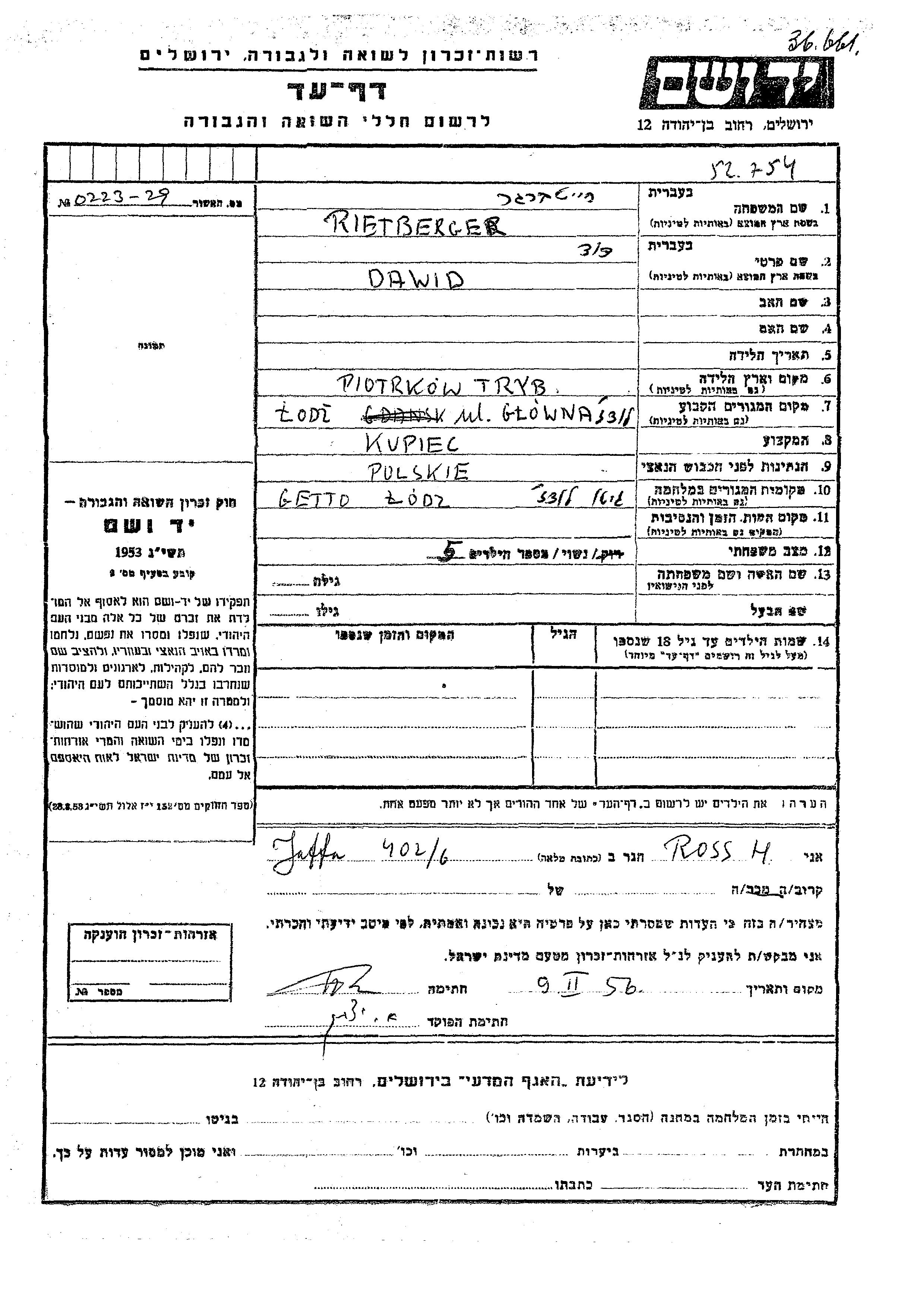 Dawid Rietberger wurde in Piotrkow Trybunalski, Polen geboren. Er war Kaufmann/-frau und Verheiratet. Vor dem Zweiten Weltkrieg lebte er in Lodz, Polen. Während des Krieges war er in Lodz, Polen.