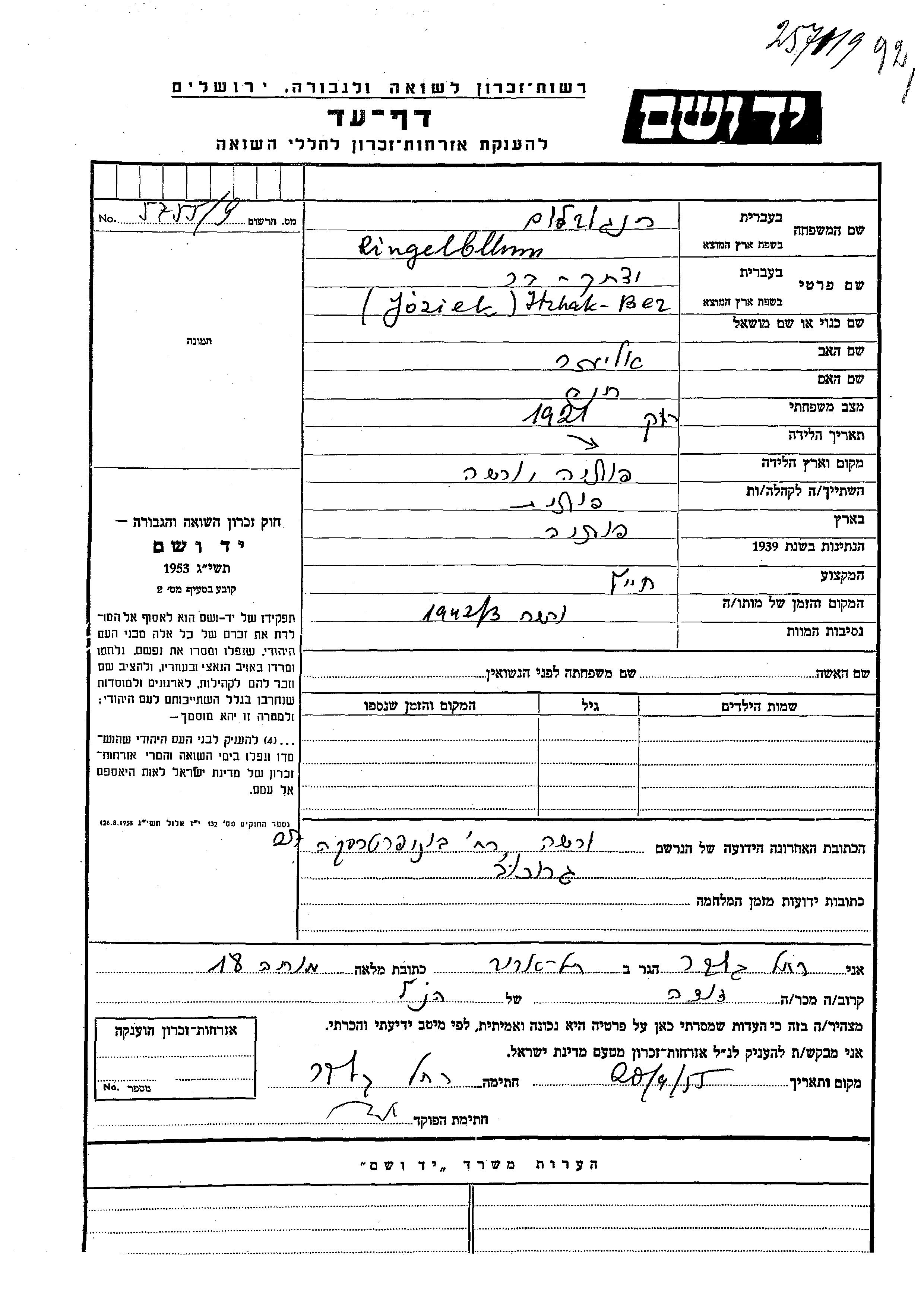 Itzhak Joziek Ber Ringelblum wurde im Jahr 1921 in Warsaw, Polen geboren. Er war der Sohn von Eliezer und Khana. Er war Soldat. Während des Krieges war er in Warsaw, Polen.