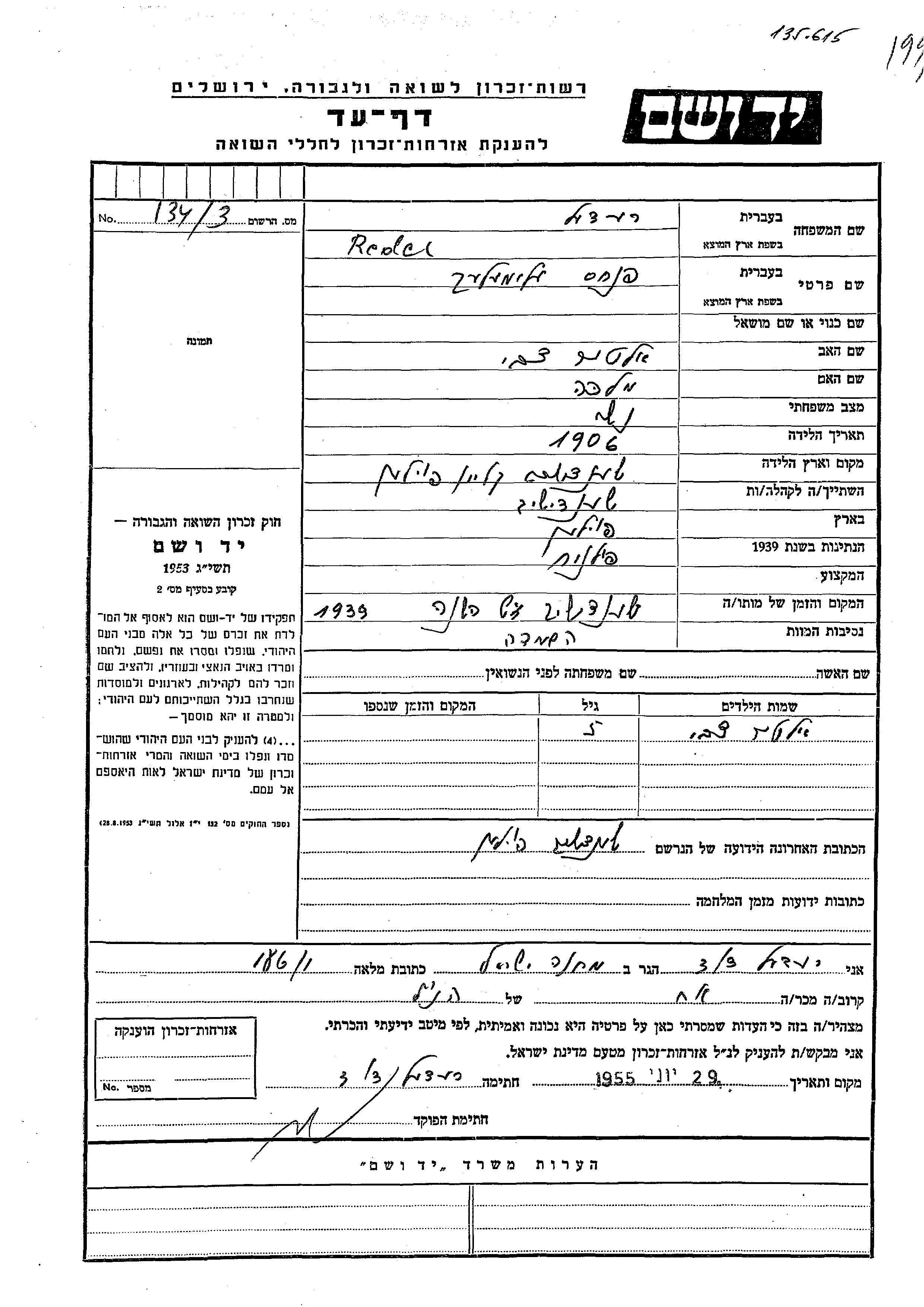 Pinkhas Elimelekh Redel wurde im Jahr 1906 in Sedziszow, Polen geboren. Er war der Sohn von Altir Tzvi und Malka. Er war Verheiratet. Vor dem Zweiten Weltkrieg lebte er in Sedziszow, Polen. Während des Krieges war er in Sedziszow, Polen.