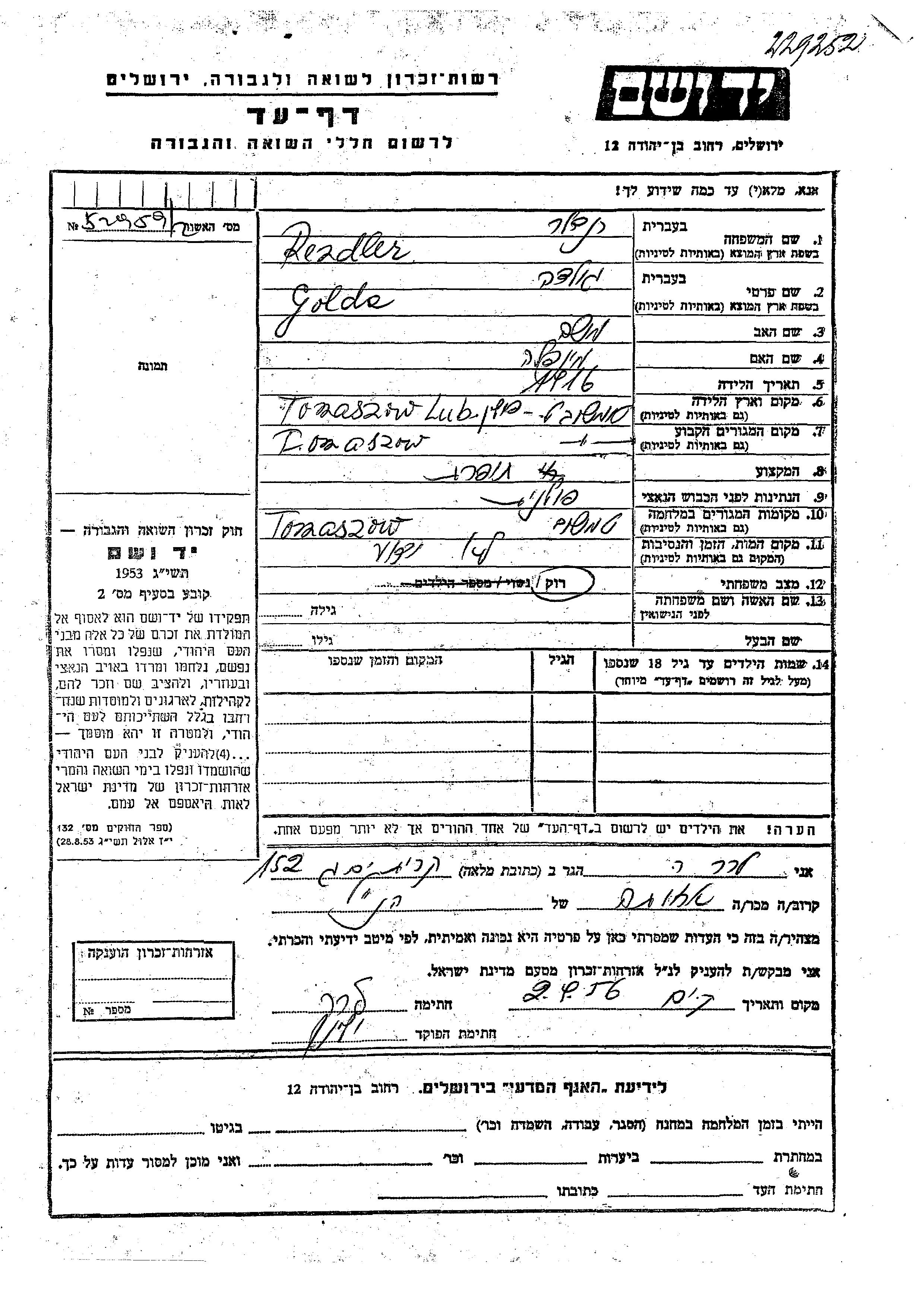 Golda Rendler wurde im Jahr 1916 in Tomaszow Lubelski, Polen geboren. Sie war die Tochter von Moshe und Mindla. Sie war Schneiderin und Ledig. Vor dem Zweiten Weltkrieg lebte sie in Tomaszow Lubelski, Polen. Während des Krieges war sie in Tomaszow, Polen.