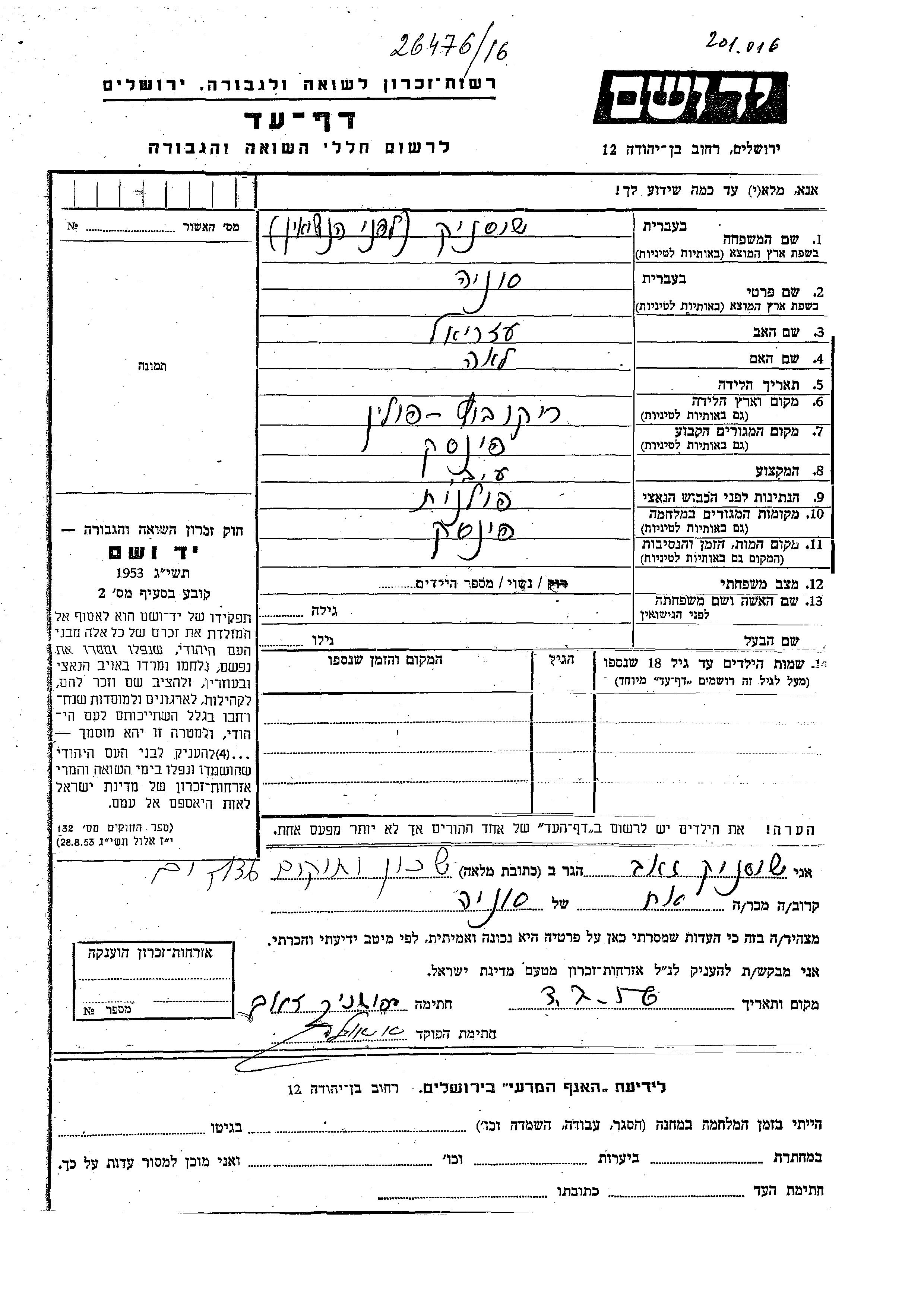 Sonia Name unbekannt, geb. Shosnik wurde in Rakowice, Polen geboren. Sie war die Tochter von Azriel und Lea. Sie war Hausfrau und Verheiratet. Vor dem Zweiten Weltkrieg lebte sie in Pinsk, Polen. Während des Krieges war sie in Pinsk, Polen.