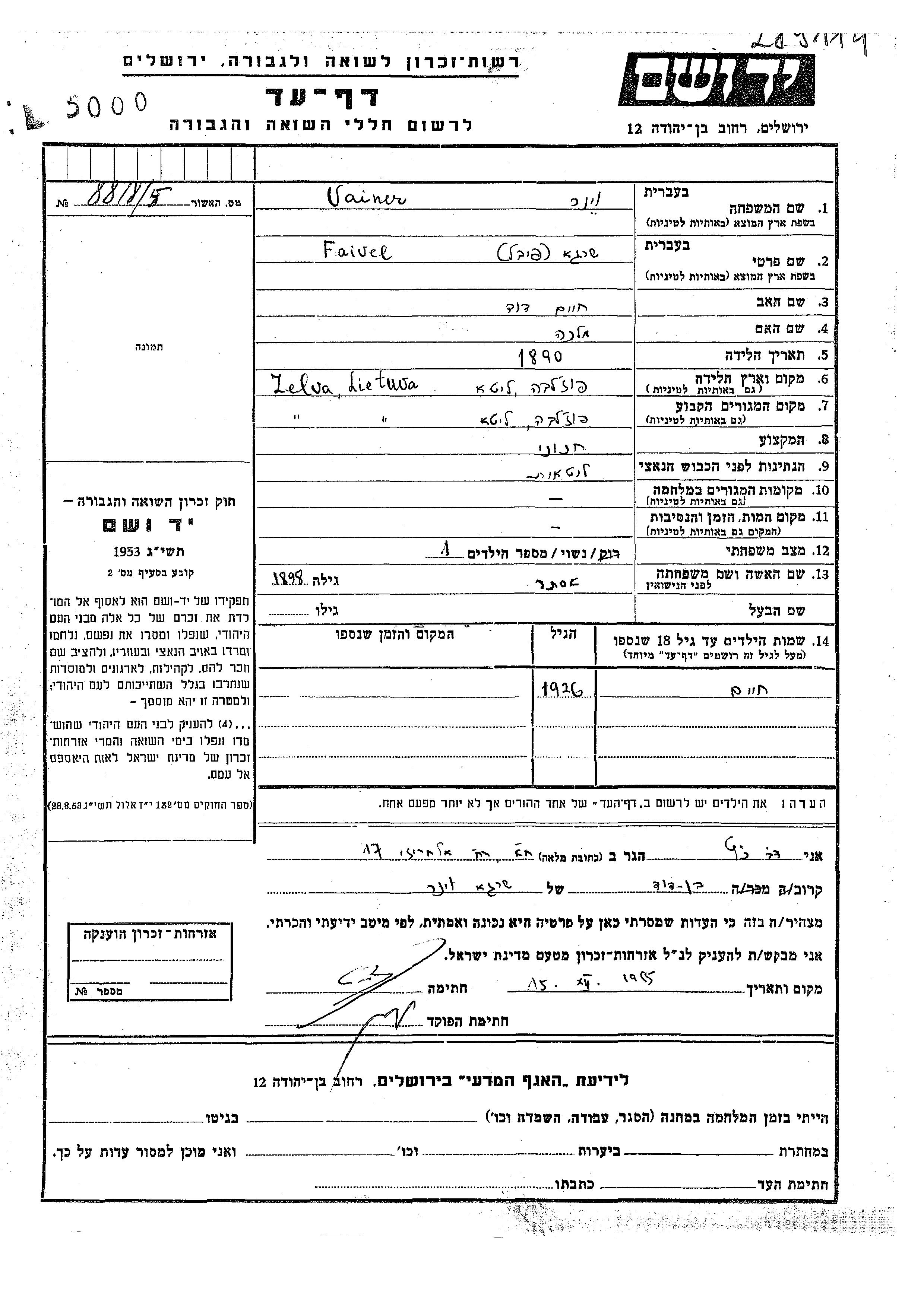 Vainer Viner Faivel Shraga 1890 Zelva, Litauen Gedenkblatt