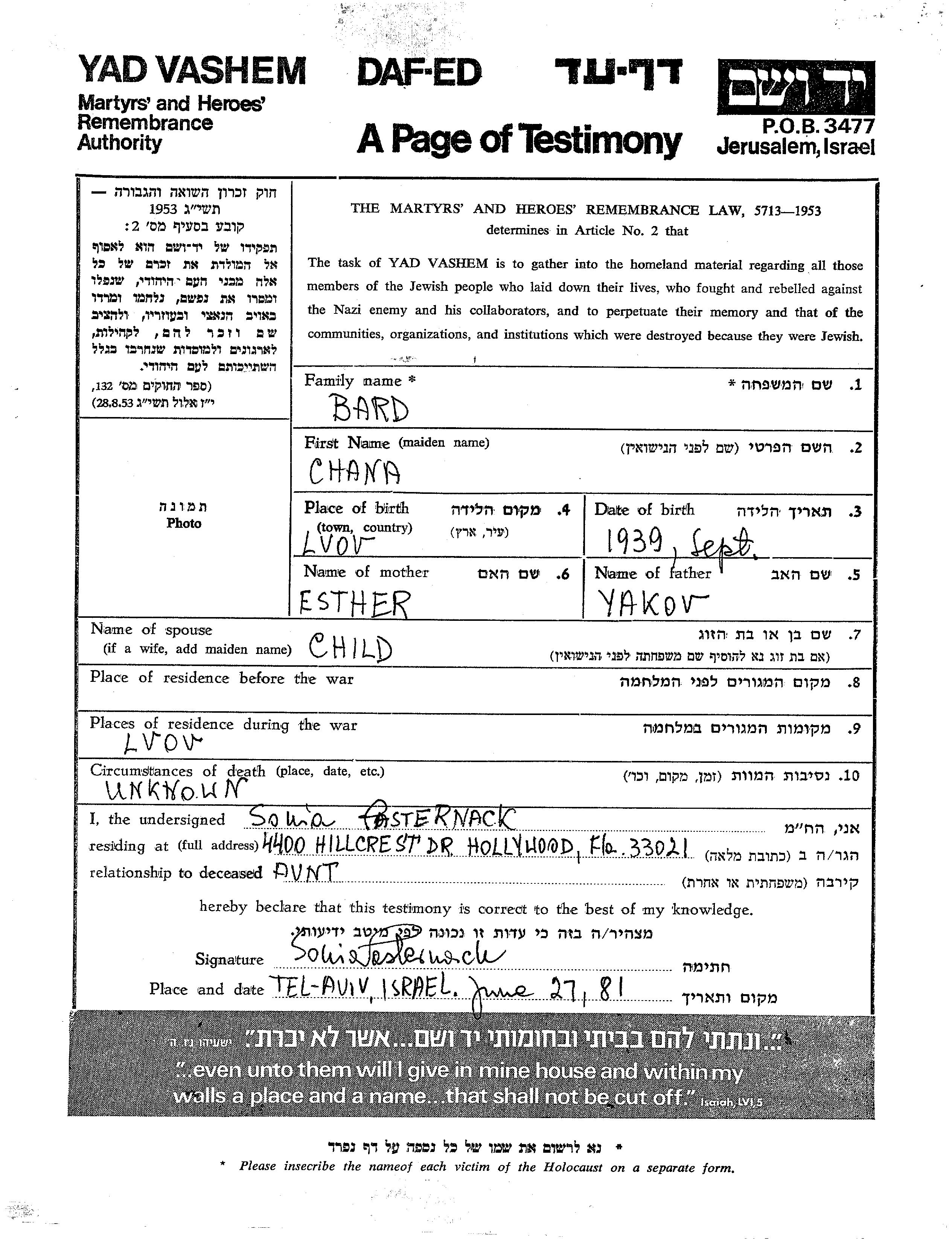 Chana Bred wurde im Jahr 1939 in Lvov, Polen geboren. Sie war die Tochter von Yakov und Esther. Sie war Ledig. Während des Krieges war sie in Lvov, Polen.