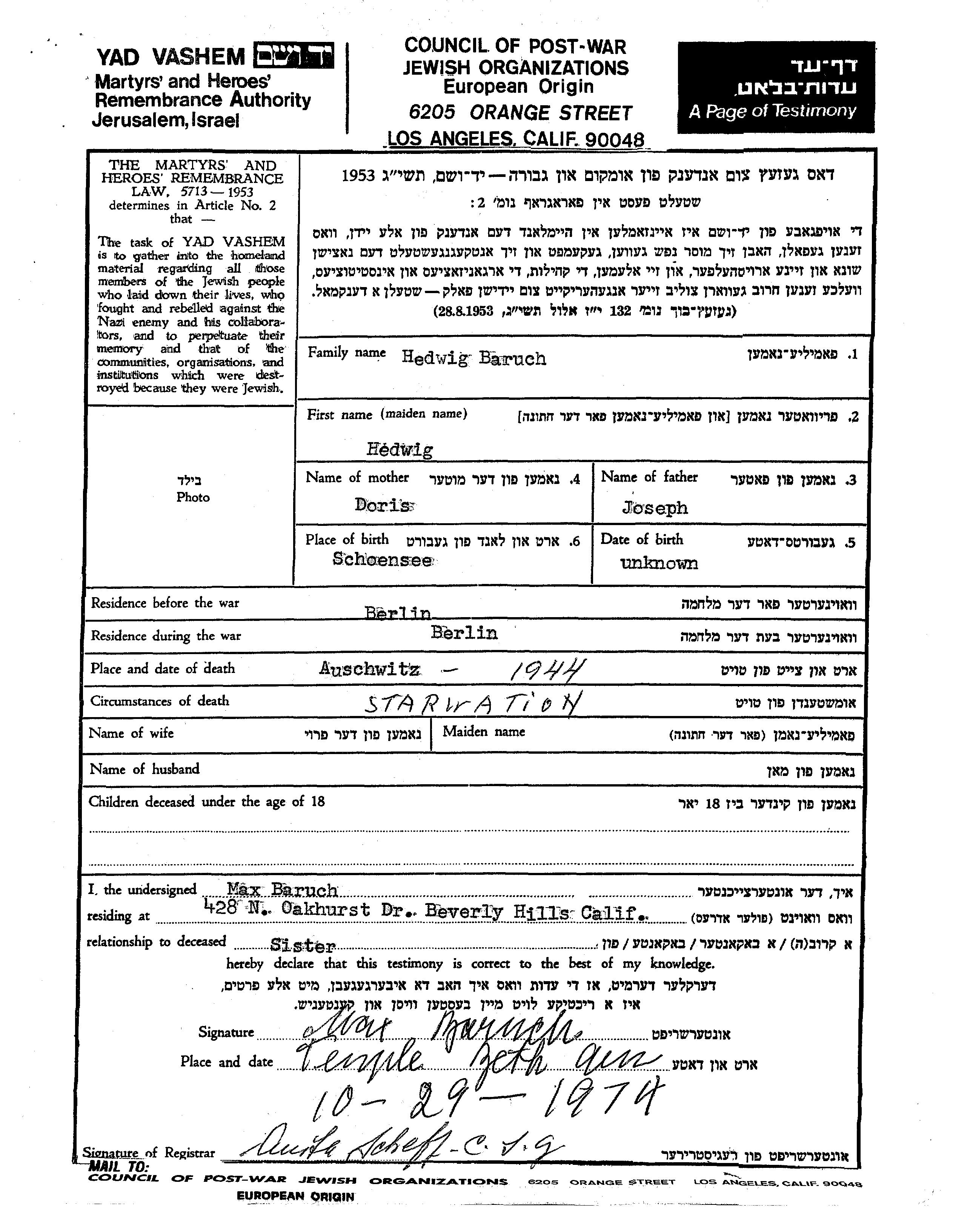 Hedwig Baruch wurde in Schoensee, Deutsches Reich geboren. Sie war die Tochter von Joseph und Doris. Vor dem Zweiten Weltkrieg lebte sie in Berlin, Deutsches Reich. Während des Krieges war sie in Berlin, Deutsches Reich.