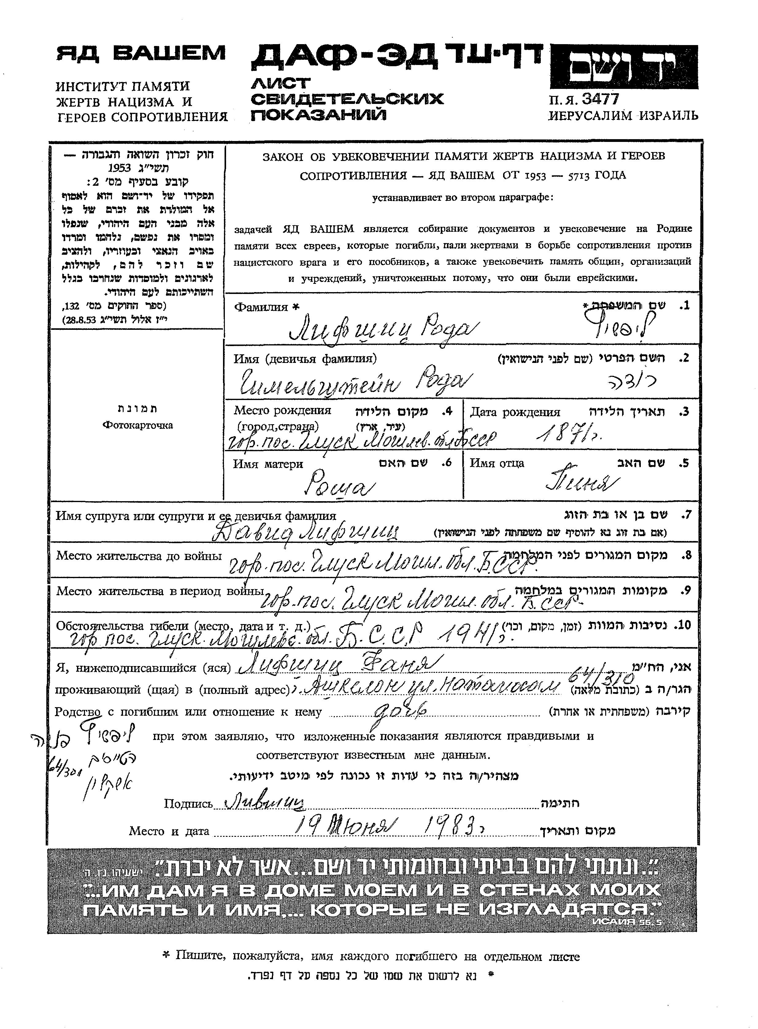 Roda Lifshitz, geb. Gimelshtein wurde im Jahr 1871 in Glusk, Weißrussland (UdSSR) geboren. Sie war die Tochter von Pinia und Rosha. Sie war mit David Verheiratet. Vor dem Zweiten Weltkrieg lebte sie in Glusk, Weißrussland (UdSSR). Während des Krieges war sie in Glusk, Weißrussland (UdSSR).