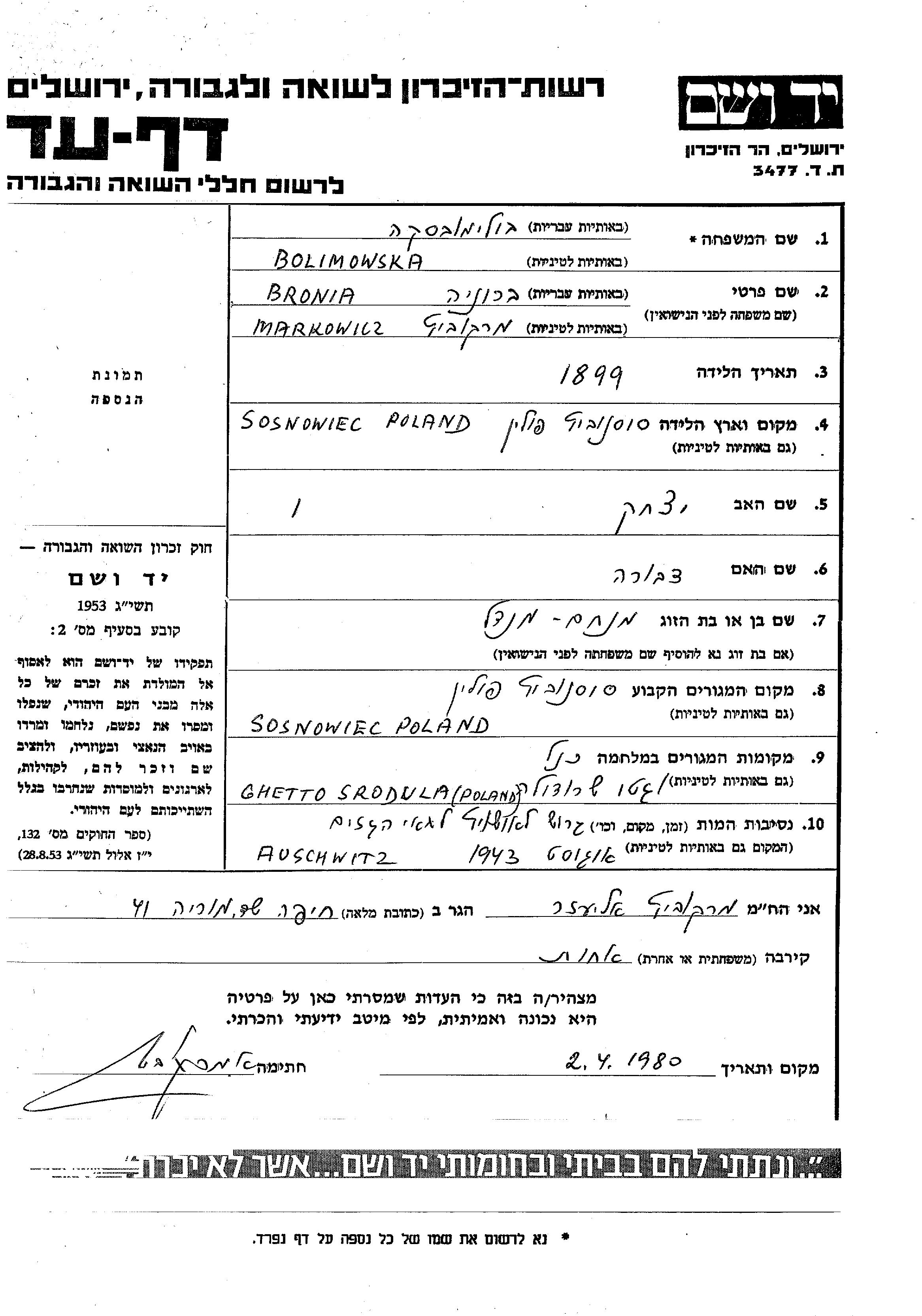 Bronia Bolimowska, geb. Markowicz wurde im Jahr 1899 in Sosnowiec, Polen geboren. Sie war die Tochter von Yitzkhak und Dvora. Sie war mit Menakhem Mendel Verheiratet. Vor dem Zweiten Weltkrieg lebte sie in Sosnowiec, Polen. Während des Krieges war sie in Sosnowiec Srodula, Polen.