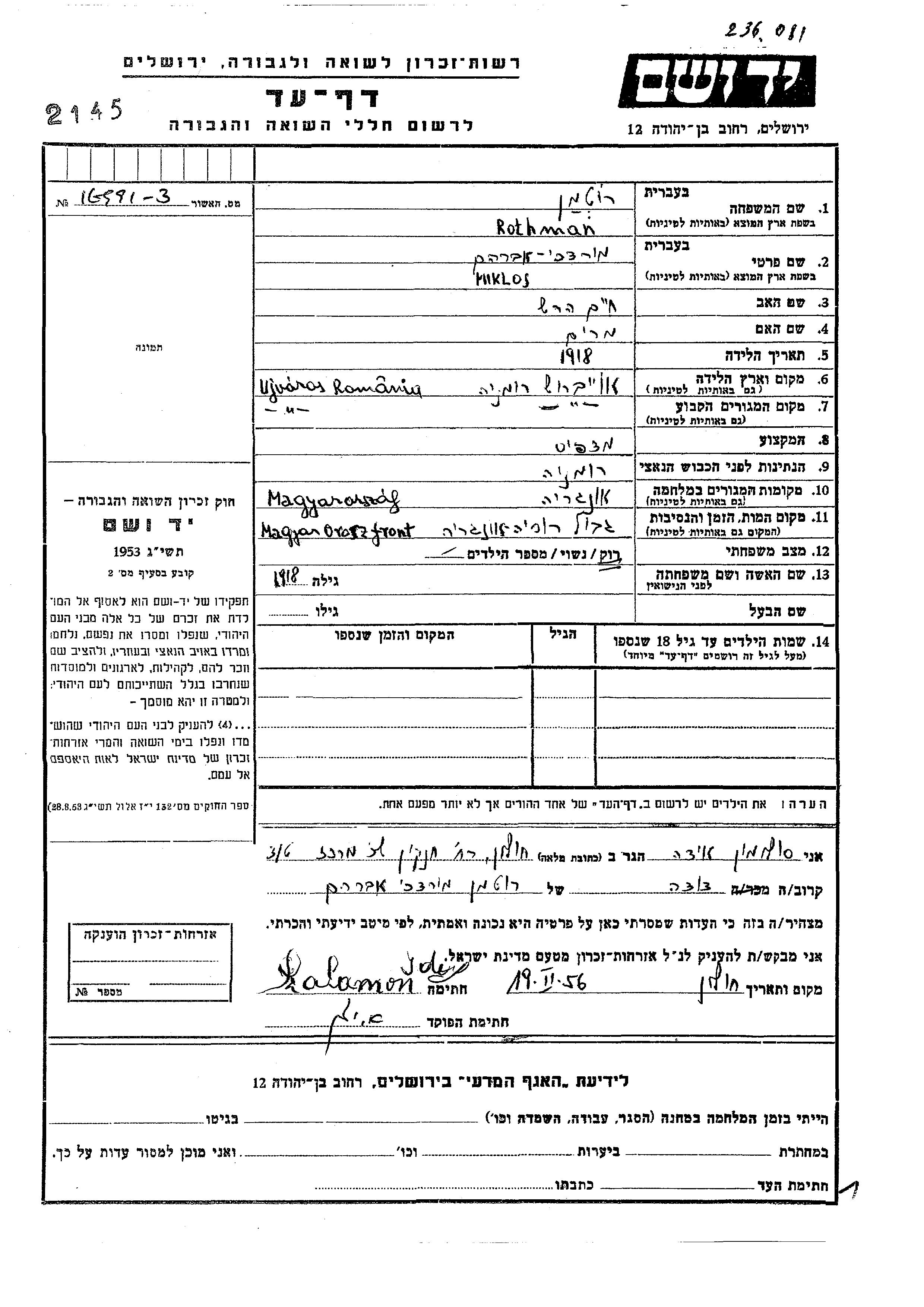 Miklos Mordekhai Avraham Rothman wurde im Jahr 1918 in Ujvaros, Rumänien geboren. Er war der Sohn von Khaim Hersh und Miriam. Er war Drucker und Ledig. Vor dem Zweiten Weltkrieg lebte er in Ujvaros, Rumänien. Während des Krieges war er in Ungarn.