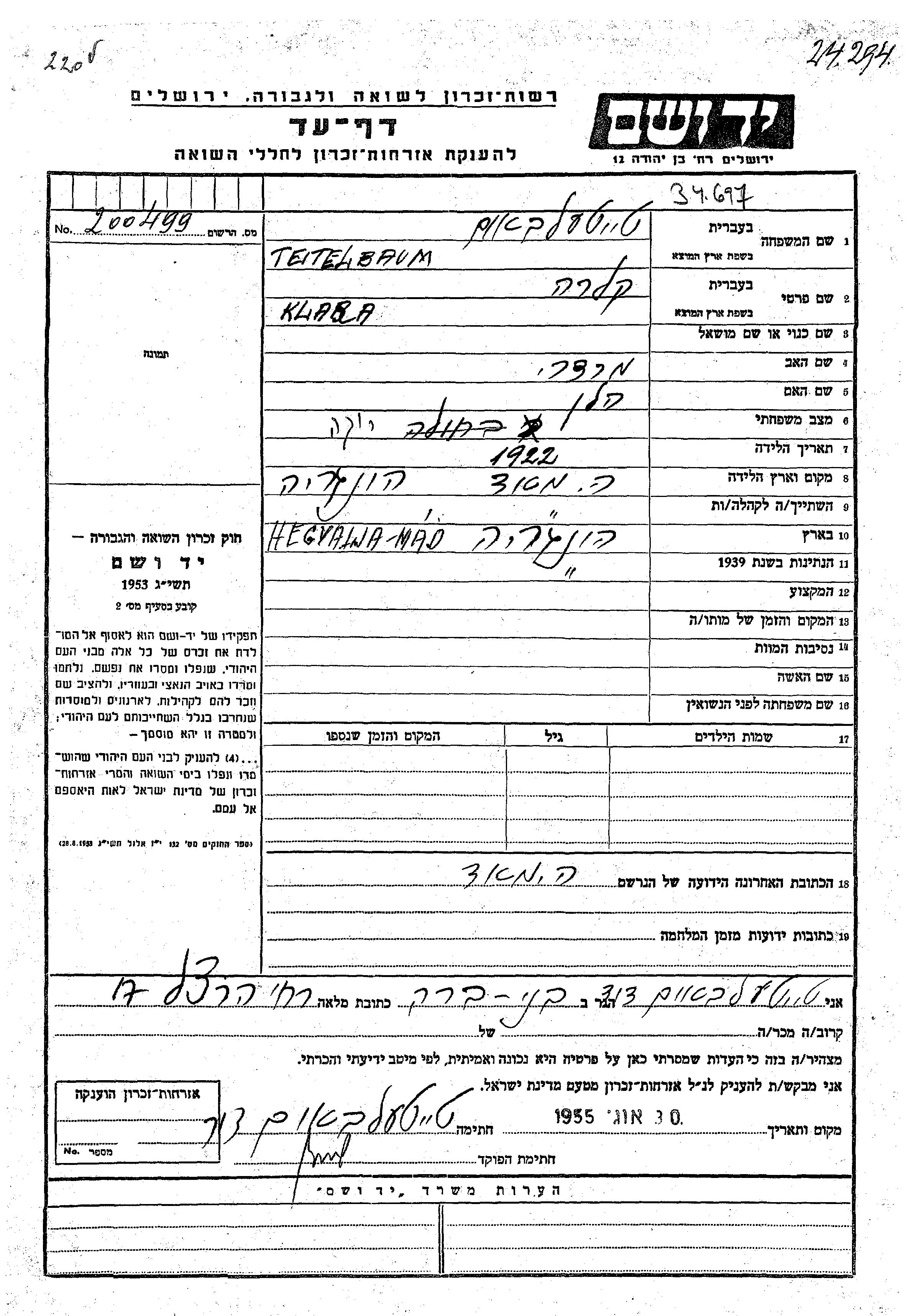 Klara Teitelbaum wurde im Jahr 1922 in Mad, Ungarn geboren. Sie war die Tochter von Mordekhai und Helen. Sie war Ledig. Vor dem Zweiten Weltkrieg lebte sie in Mad, Ungarn. Während des Krieges war sie in Mad, Ungarn.