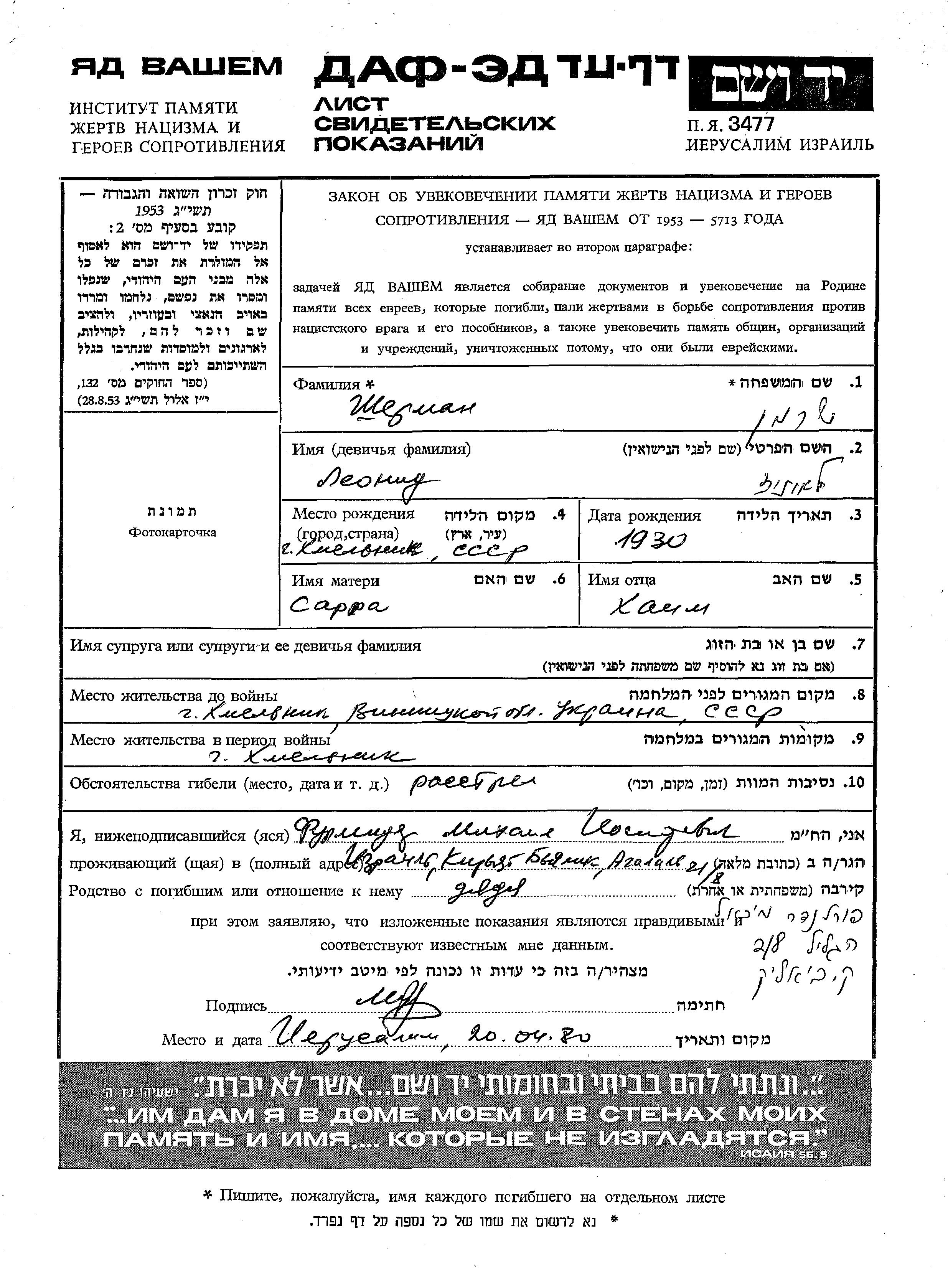 Sherman Leonid 1930 Khmelnik, Ukraine (UdSSR) Gedenkblatt