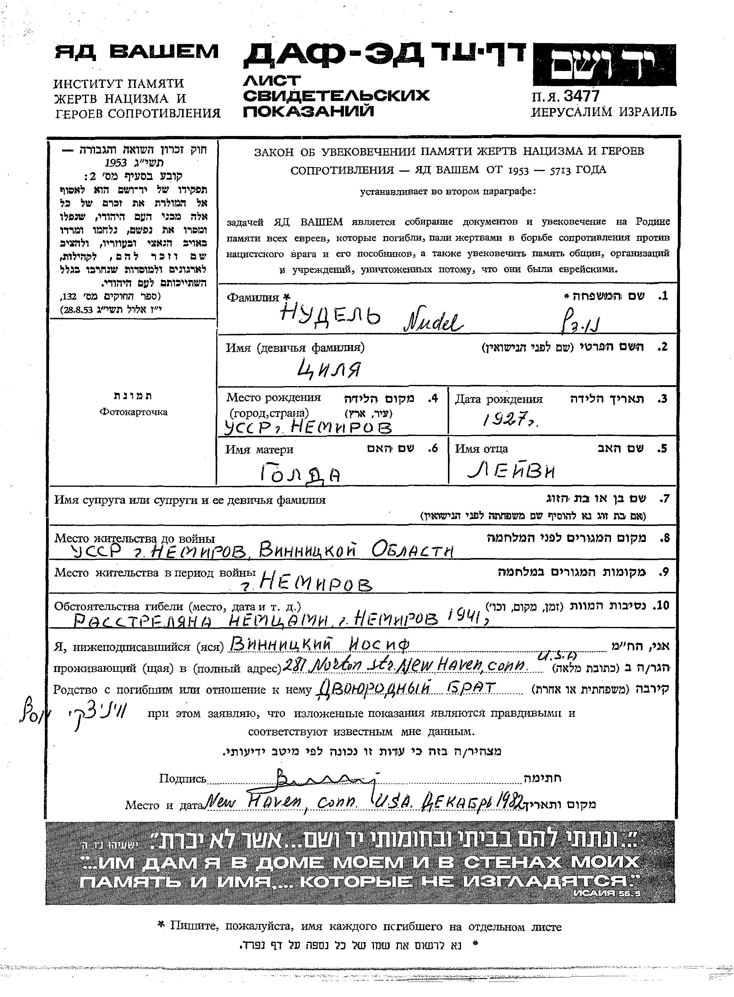 Nudel Tzilya 1927 Nemirov, Ukraine (UdSSR) Gedenkblatt