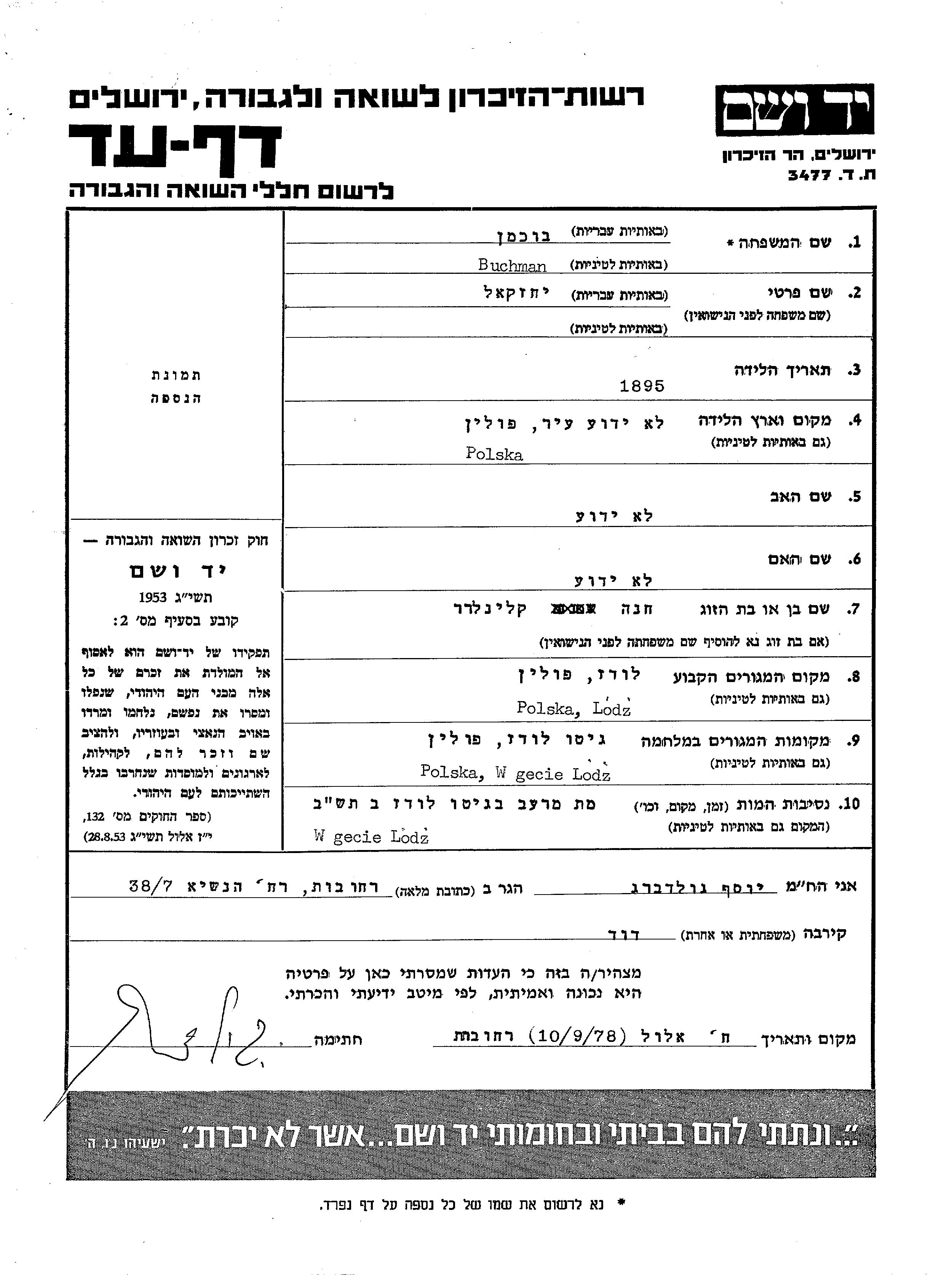 Yekhezkel Buchman wurde im Jahr 1895 in Polen geboren. Er war mit Khana, geb. Kleinlehrer Verheiratet. Vor dem Zweiten Weltkrieg lebte er in Lodz, Polen. Während des Krieges war er in Lodz, Polen.