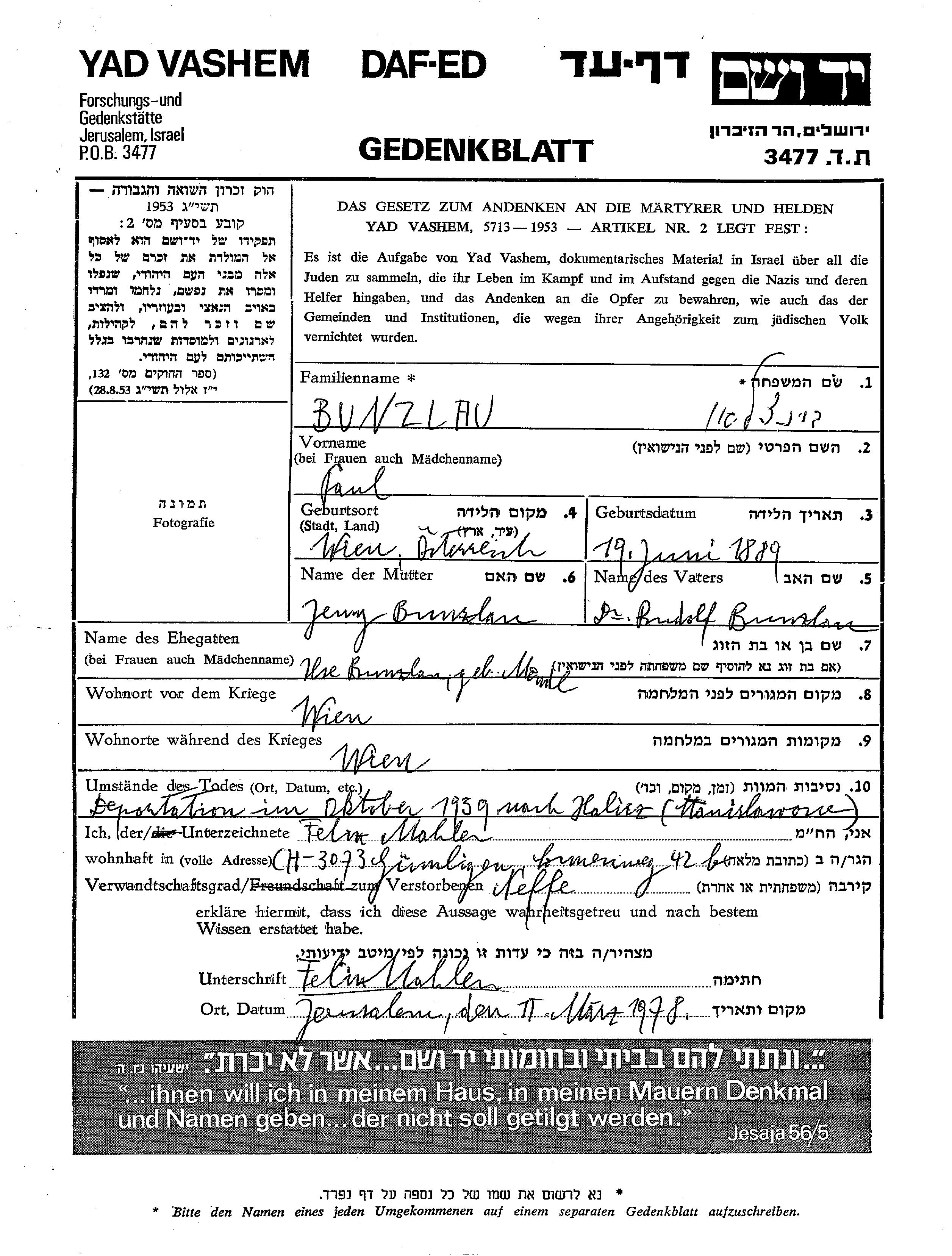 Paul Bunzlau wurde im Jahr 1889 in Wien, Österreich geboren. Er war der Sohn von Rudolf und Jenny. Er war mit Ilse, geb. Mendl Verheiratet. Vor dem Zweiten Weltkrieg lebte er in Wien, Österreich. Während des Krieges war er in Wien, Österreich.