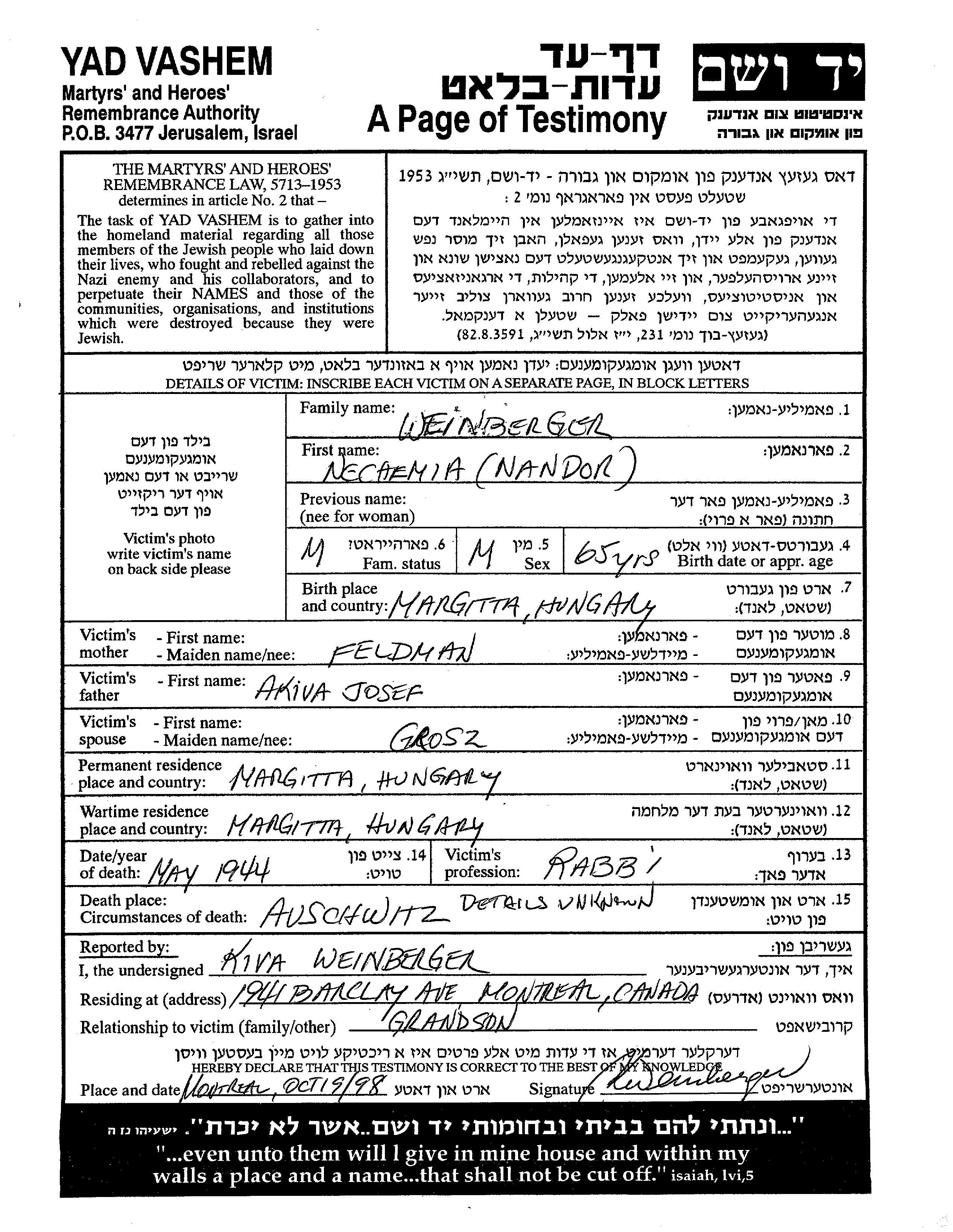 Nechemia Nandor Weinberger wurde in Margitta, Rumänien geboren. Er war der Sohn von Akiva Josef. Er war Rabbiner und Verheiratet. Vor dem Zweiten Weltkrieg lebte er in Margitta, Rumänien. Während des Krieges war er in Margitta, Rumänien.