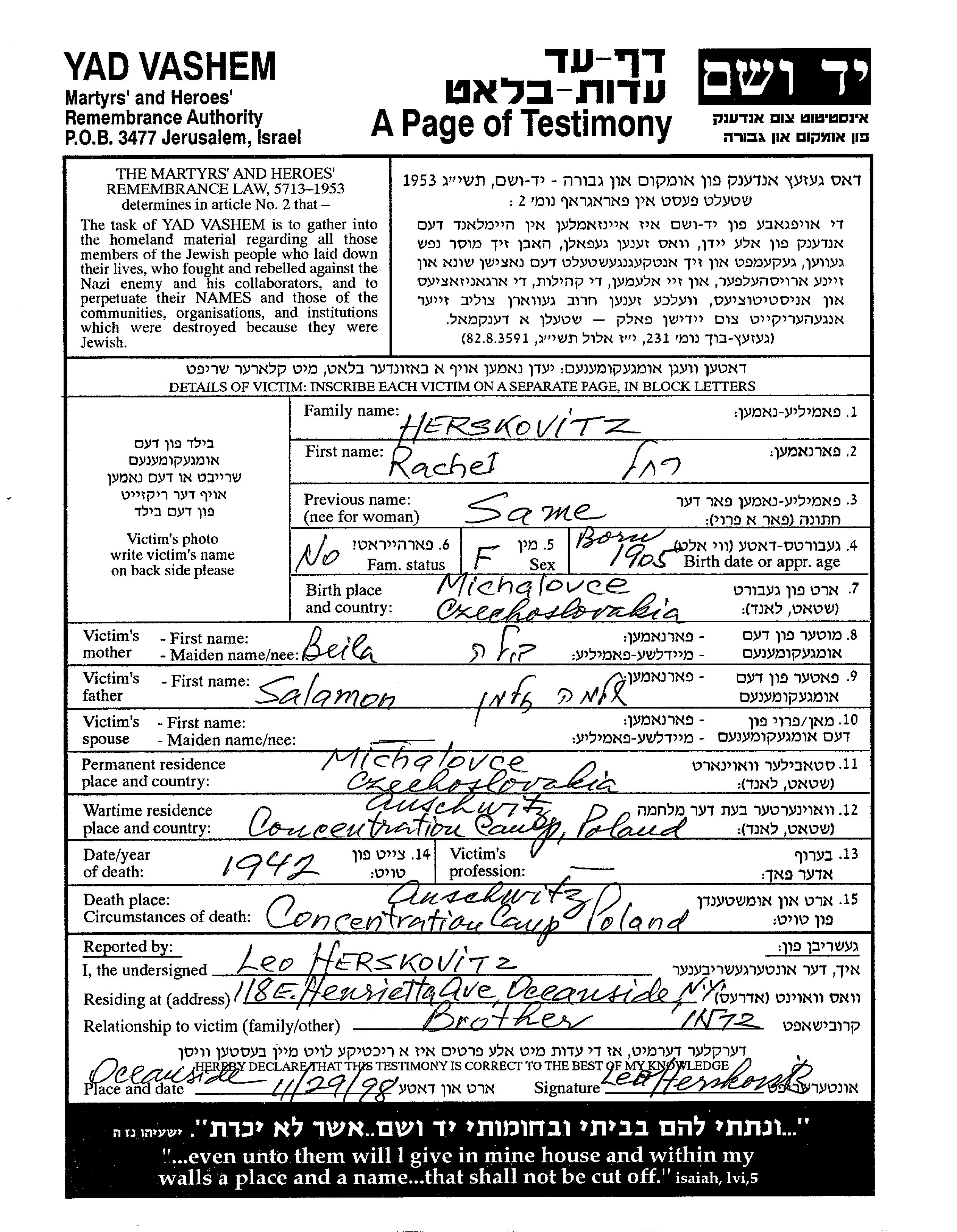 Herskovitz Rachel 1905 Michalovce, Tschechoslowakei Gedenkblatt