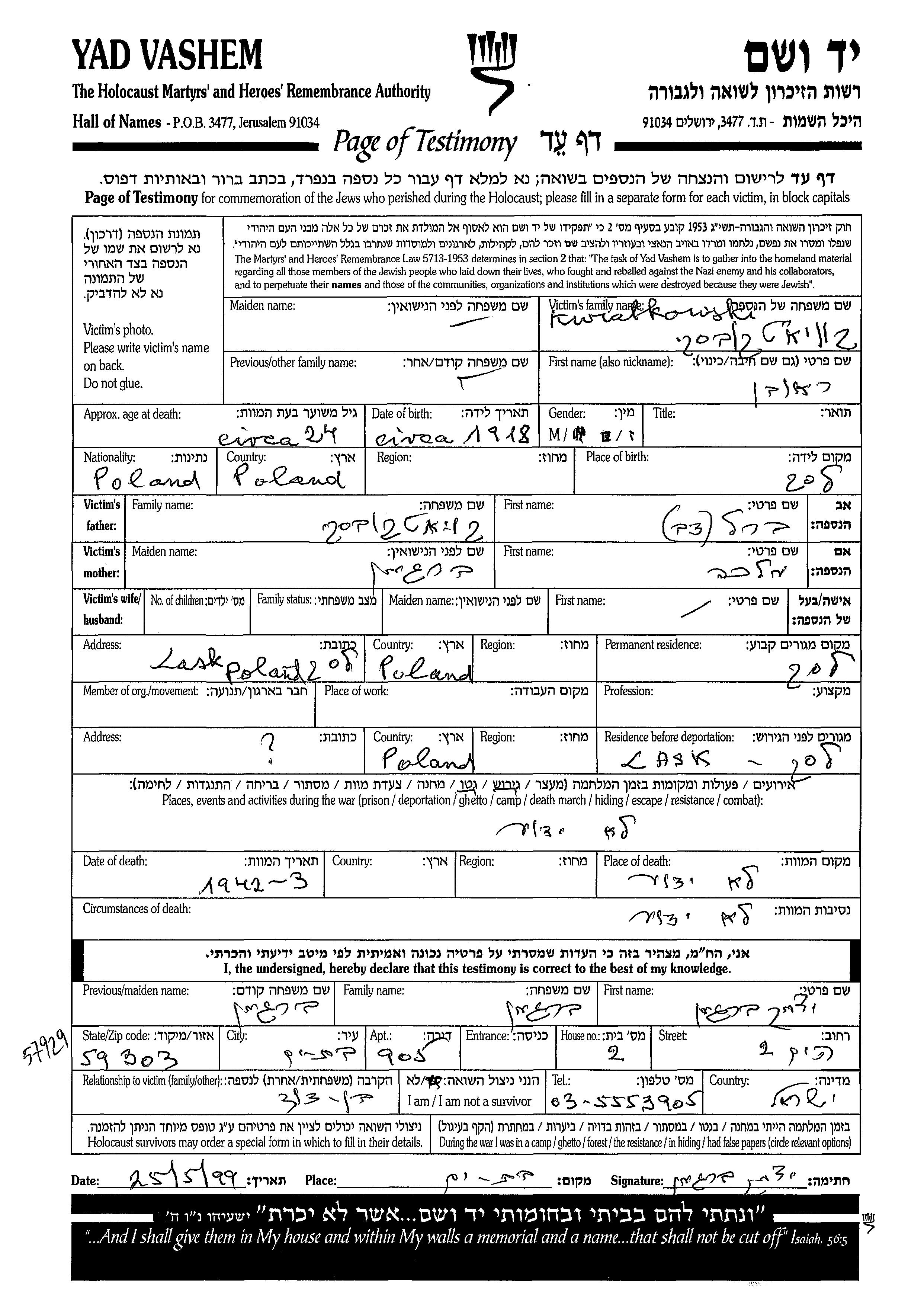 Reuven Kwiatkowski wurde im Jahr 1918 in Lask, Polen geboren. Er war der Sohn von Berl Dov und Malka. Vor dem Zweiten Weltkrieg lebte er in Lask, Polen. Während des Krieges war er in Lask, Polen.