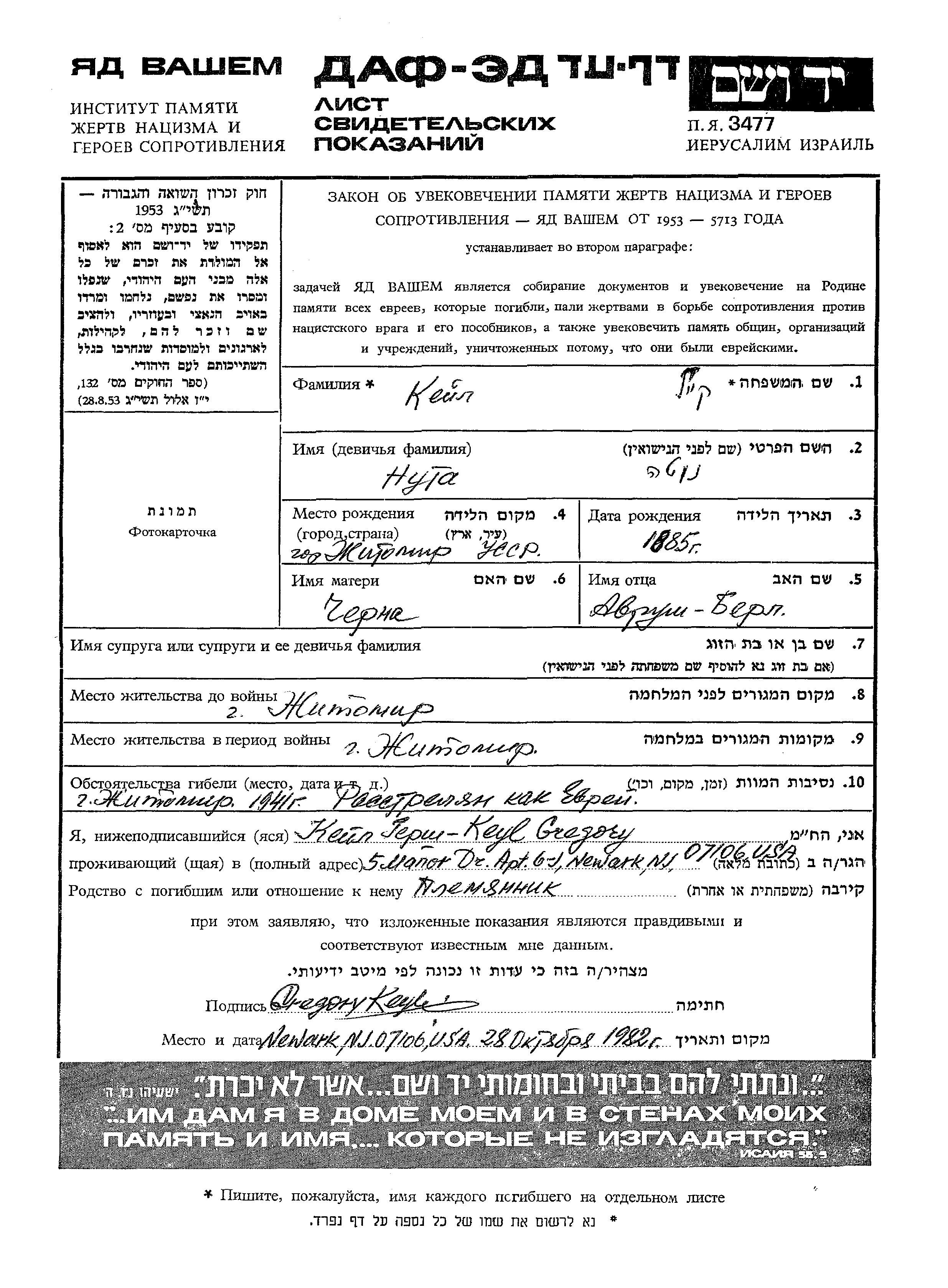 Nuta Keil wurde im Jahr 1885 in Zhitomir, Ukraine (UdSSR) geboren. Er war der Sohn von Avrum Berl und Cherna. Vor dem Zweiten Weltkrieg lebte er in Zhitomir, Ukraine (UdSSR). Während des Krieges war er in Zhitomir, Ukraine (UdSSR).