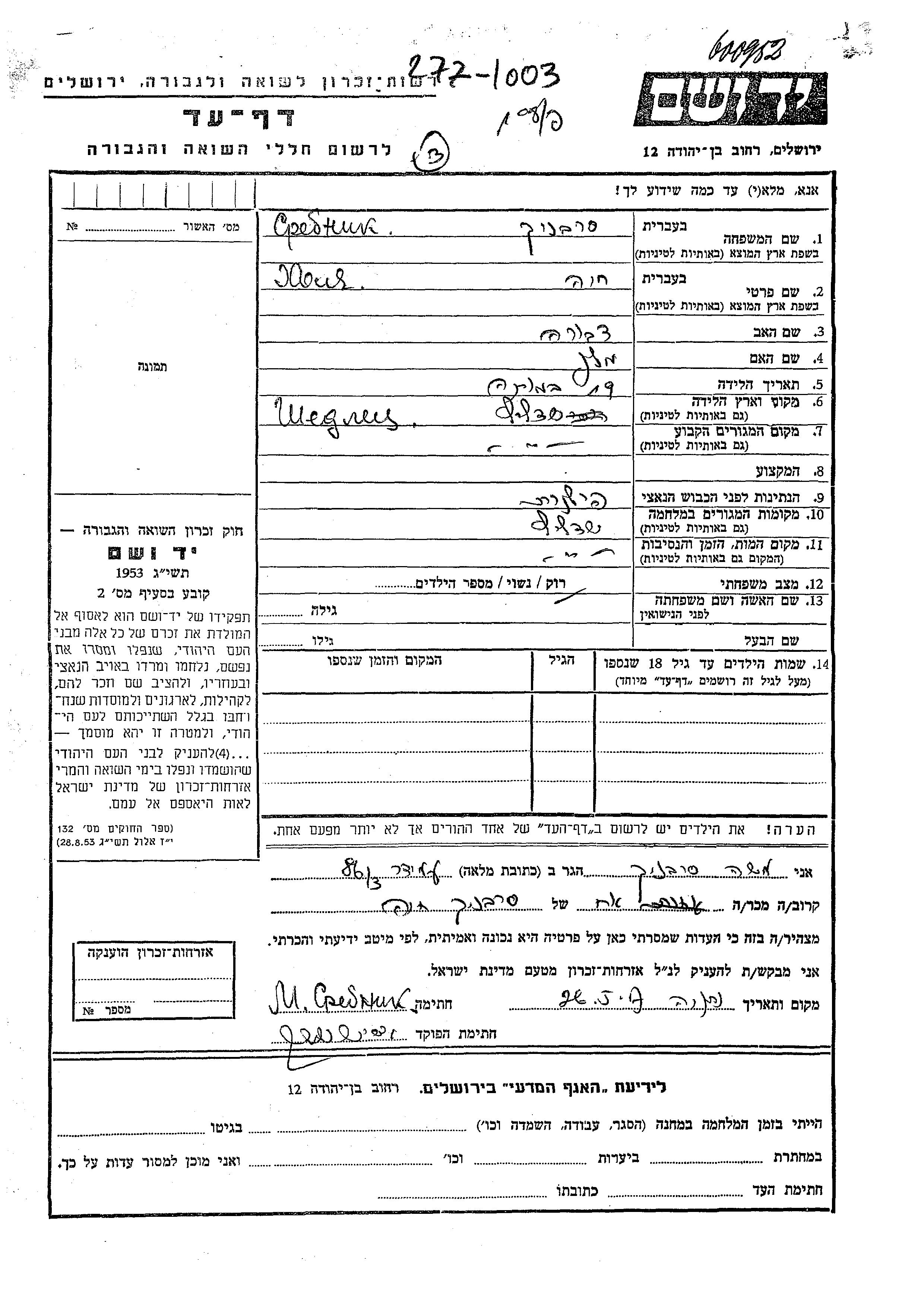Srebnik Khaia Khava unbekannter Ort, Gedenkblatt