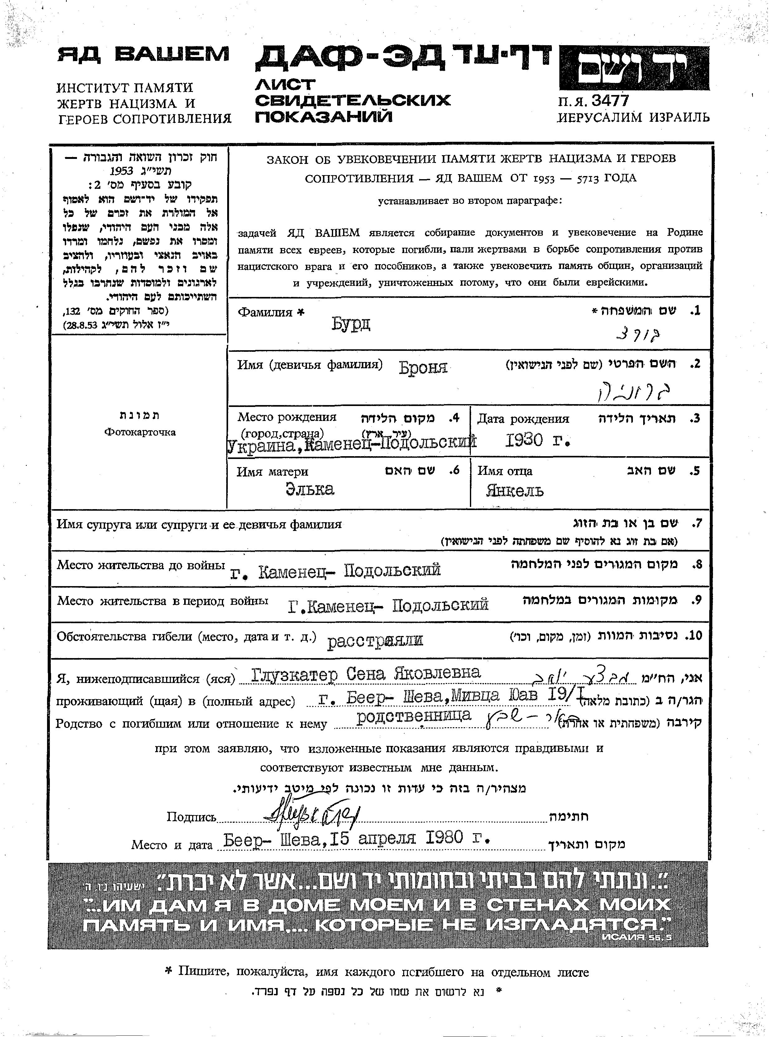 Bronya Burd wurde im Jahr 1930 in Kamenetz, Polen geboren. Sie war die Tochter von Yankel und Elka. Vor dem Zweiten Weltkrieg lebte sie in Kamenetz, Polen. Während des Krieges war sie in Kamenetz, Polen.