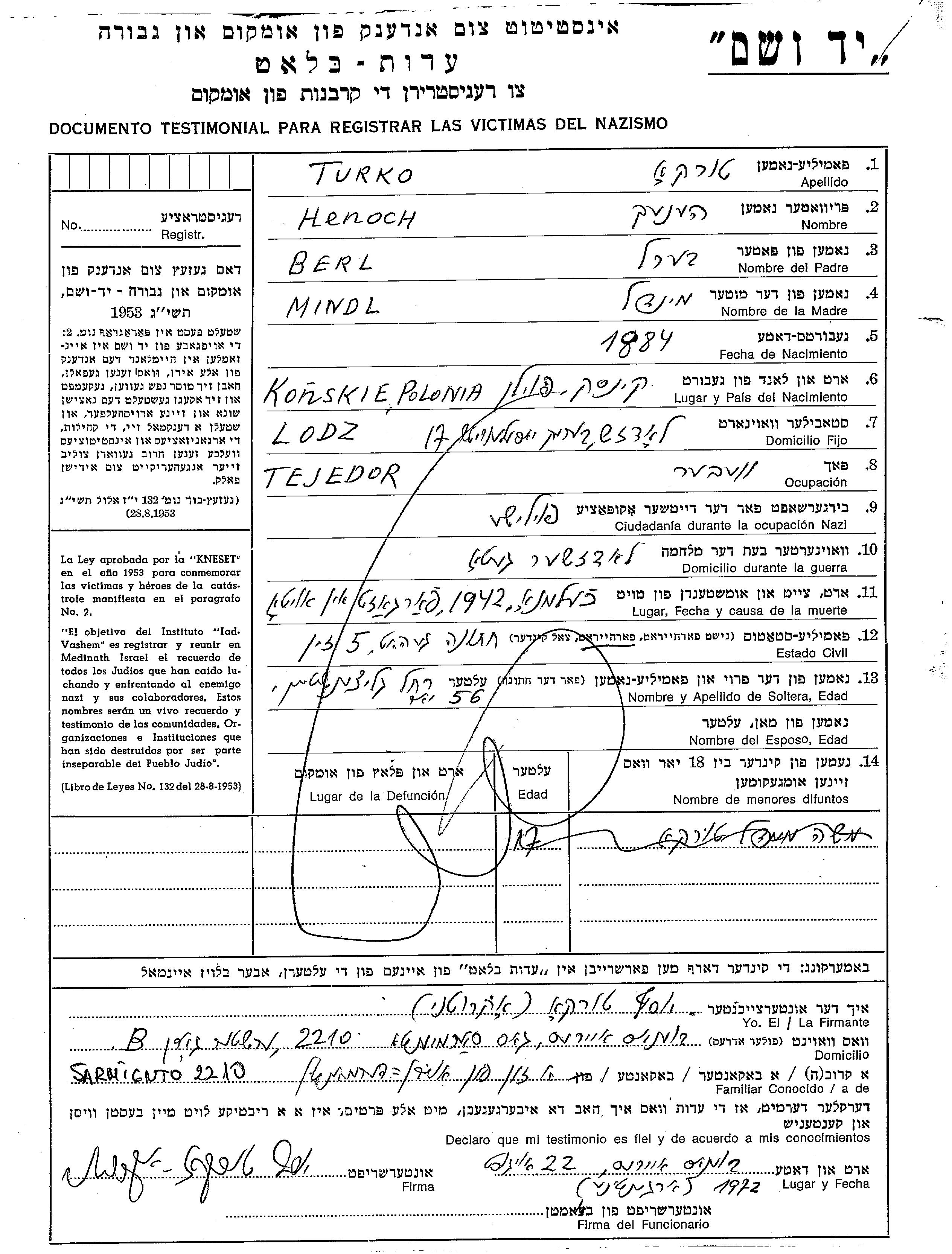 Henekh Turko wurde im Jahr 1884 in Konskie, Polen geboren. Er war der Sohn von Berl und Mindl. Er war Weber/-in und mit Rakhel, geb. Glitzenshtein Verheiratet. Vor dem Zweiten Weltkrieg lebte er in Lodz, Polen. Während des Krieges war er in Lodz, Polen.